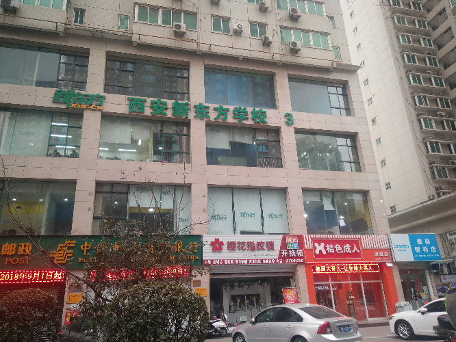 12月25日,记者来到了西安市雁南一路陕师大附中分校。学校门口向东不远的地方这家成人用品商店显得非常显眼。而在这家成人用品店的楼上还有一家新东方学校。门头上LED屏滚动播放着一些介绍成人用品的内容。