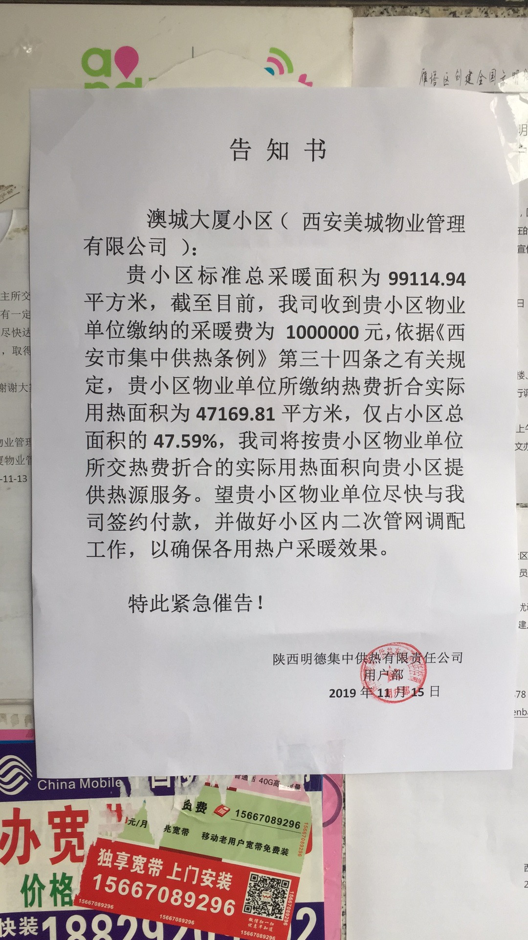雁塔区网络发言人回复:网友你好,经长延堡街道核实,澳城大厦小区供暖方式为市政集中供暖,物业公司为代收代缴。2019年,明德热力公司在西安市房地产官网调阅澳城大厦小区实际建筑面积资料,供暖面积有所调整。经过双方对小区建筑面积进行核定,物业公司与明德热力于11月16日签订供暖协议。截止11月14日,物业公司已代收1号楼业主取暖费。15日,物业公司将代收的款项交给明德热力公司,所缴费用只占供热面积的40%流量,2号楼和酒店已申请暖气空置。14日晚,街办联合区城管执法局与明德热力召开协调会后,明德热力同意先向小区开启暖气阀。15日,街办要求物业公司将代收业主暖气费明细在小区进行公示,物业公司已于当天进行公示。