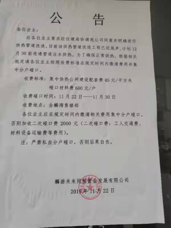 2019年九月份又经过无数次的跟城建局县政府协调,达成共识,同意施工供暖,终于在10月3日开始施工,当时合同和口头协议答应在施工期间不给业主产生任何费用,于11月15日正常通双气,到时只交第一季供暖费,没想到施工又逾期了,可是现在施工接近尾声了,又伸手向业主们掏腰包,初装费每平米45元,材料费每户680元,这又从何说起?