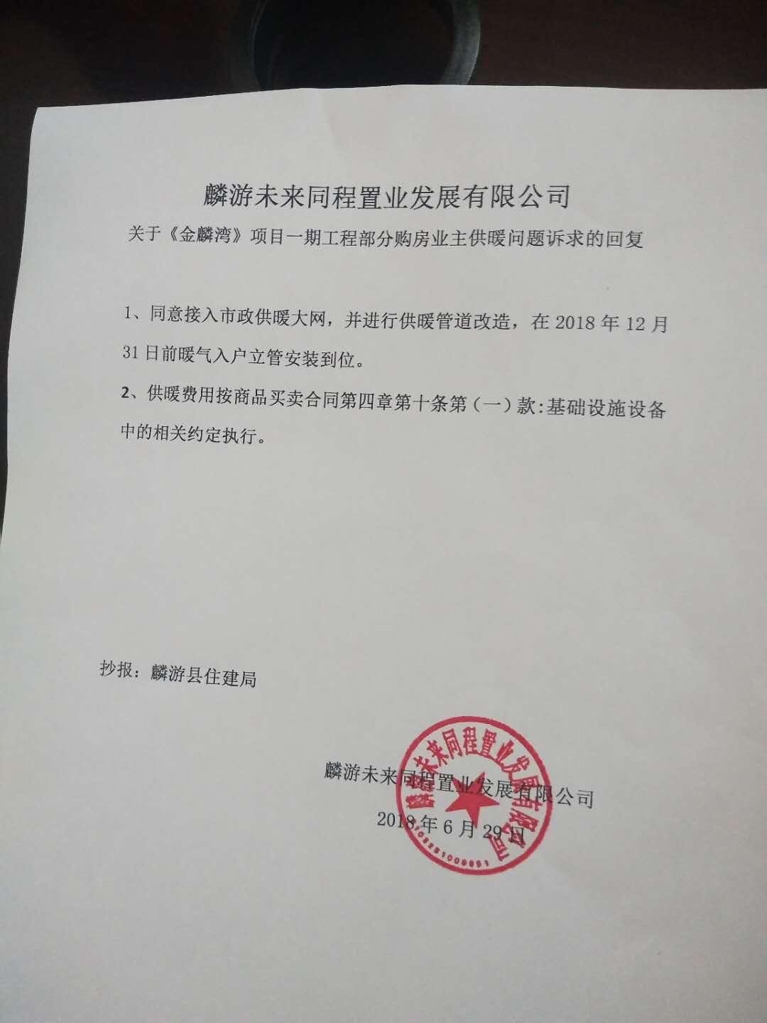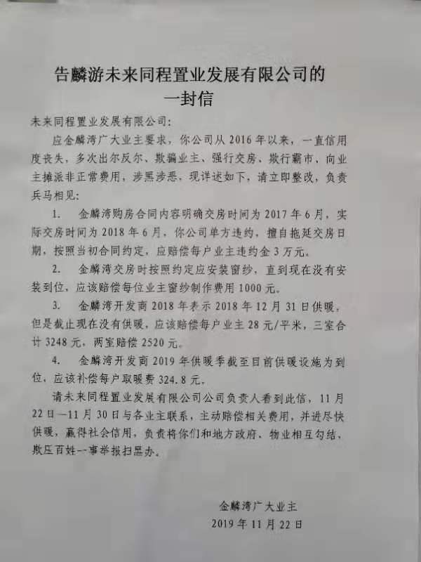 尊敬的市长您好,我代表麟游县金麟湾小区部分业主,现向贵领导诉求公正,开发商交房逾期一年多不说,业主都忍了,当时交房时说双气入户到位,业主去年跑了几次书面东西2018年12月30号按装到位,可是又是一次失约,业主们没办法凑合受冻在寒舍度过了2018的严冬,冻坏十几户的室内设施,水表129个,自来水管23处,累计27户被水淹,至今也无处问责。