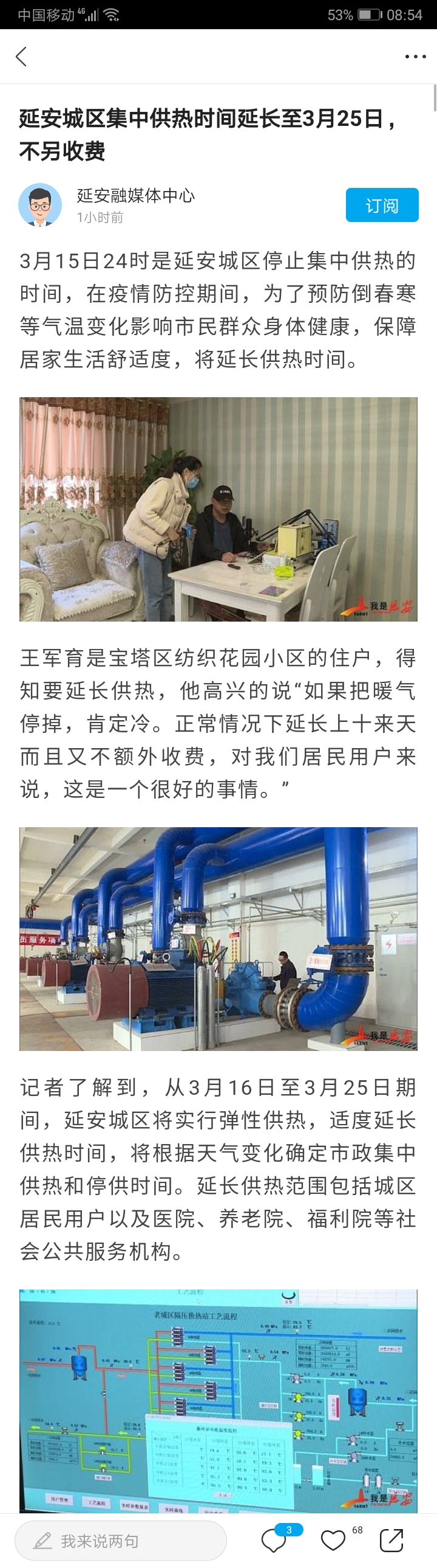 延安市民政局回复:网友留言中所提到的延安市第二社会福利院家属院名称为民乐小区,是延安市民政系统家属院,由民乐社区服务中心负责物业管理,用小区自备天然气锅炉供热,起止时间与延安城区市政供热同步,已确定延长供热期至2020年3月25日,不另收费用。3月18日早上,小区供热锅炉循环泵出现故障,经过维修后于下午即恢复供热。