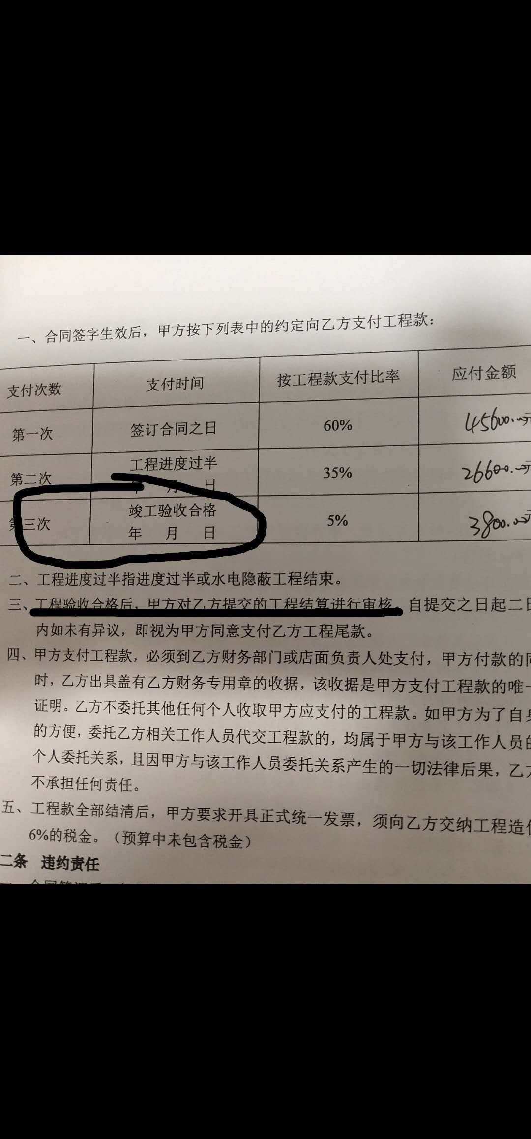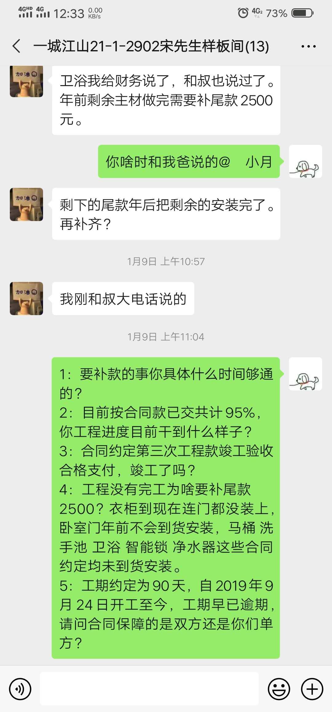 2020年1月9日(已逾期)通知我们还需要缴纳剩余5%的尾款。并说不出任何需要缴纳的合理理由,合同条款注明尾款于工程竣工验收合格交付,但润宅公司当时工程并未完工。因此我们拒绝缴纳并要求他们按照合同尽快完工再交付!截止2020年4月8日还没完工。当时双方合同约定多个事项。其中有一项工期为90天,如不达标全额退款。