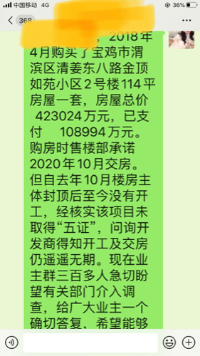 我在2018年4月购买了宝鸡市渭滨区清姜东八路金顶如苑小区2号楼114平房屋一套,房屋总价423024万元,已支付108994万元。购房时售楼部承诺2020年10月交房。但自去年10月楼房主体封顶后至今没有开工,经核实该项目未取得“五证”,问询开发商得知开工及交房仍遥遥无期。现在业主群三百多人急切盼望有关部门介入调查,给广大业主一个确切答复,希望能够尽快交房入住。