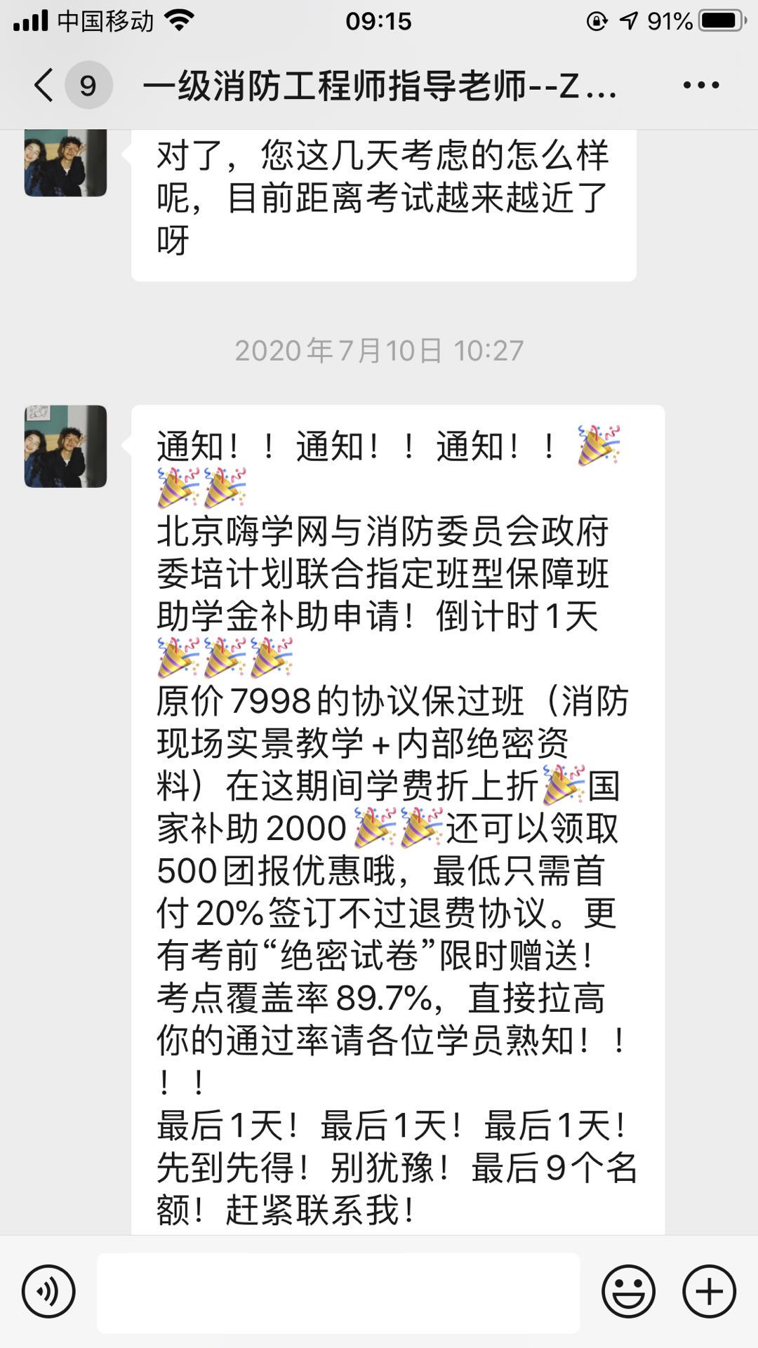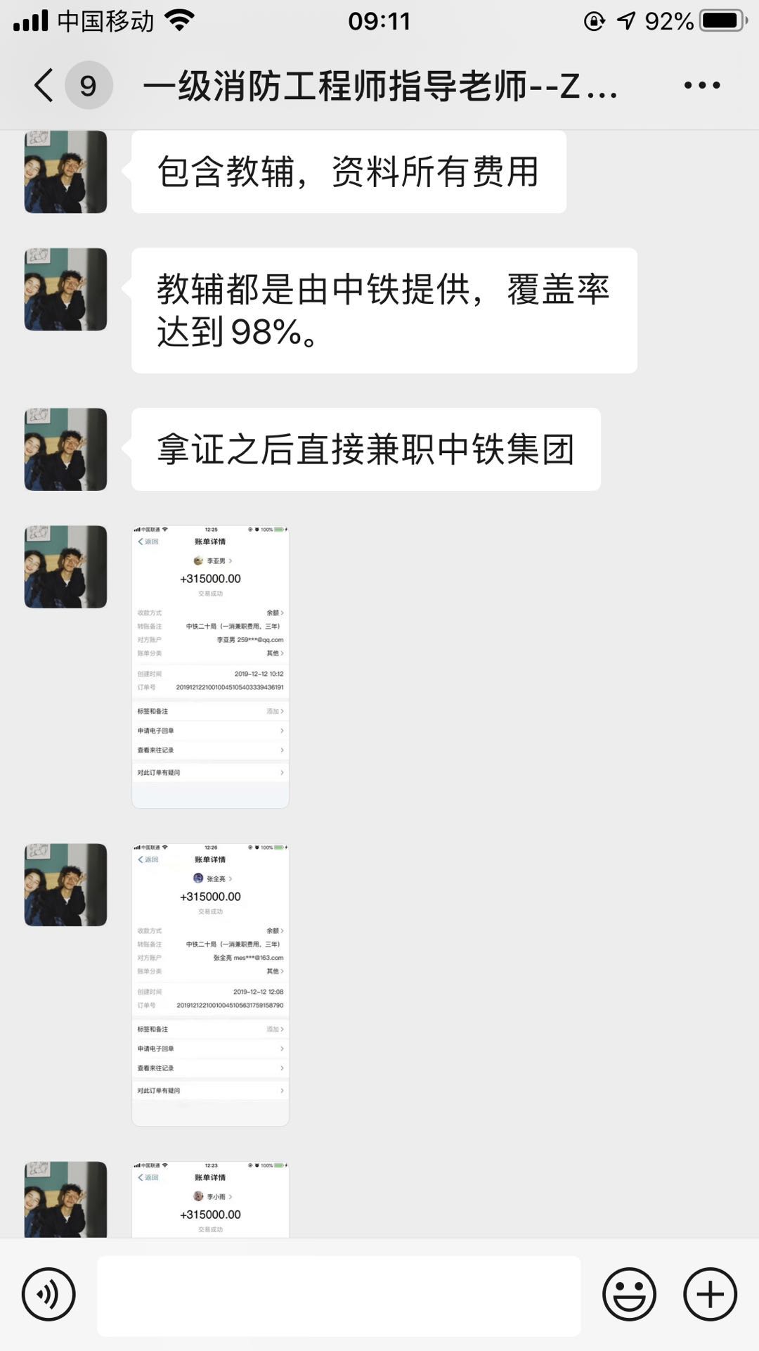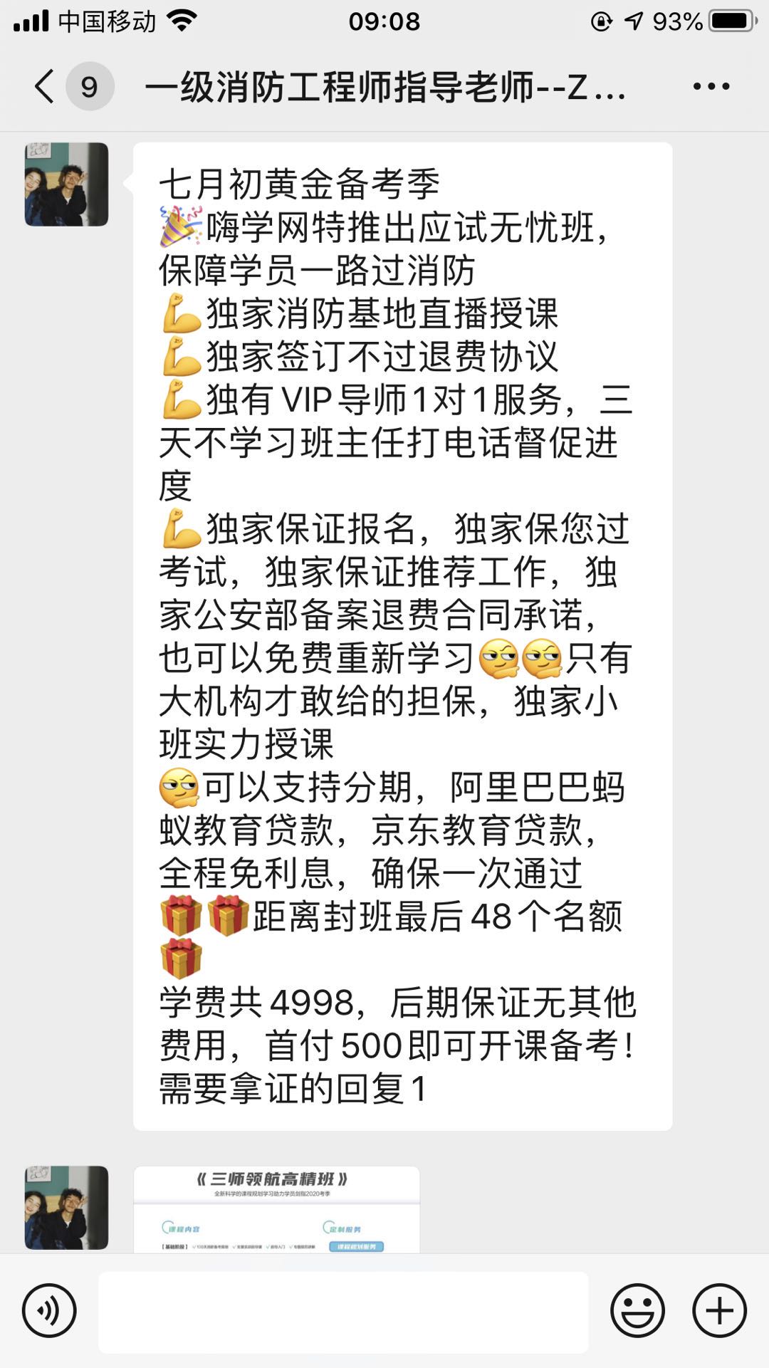 7月中旬一个自称周老师的人要求加我的微信,并自称是西安嗨学卓奥教育科技有限公司(与北京嗨学卓奥教育科技有限公司系同一法人吕敏),吹嘘他们公司规模如何如何大和好,是全国首批进入消防培训领域的单位,承诺可以代报名,包过考,有考试秘卷,包挂靠,考不过退费,保证能一次性拿到国家一级注册消防工程师资格证书,并能帮助联系到挂靠单位,每年至少能给我租证费8万元。怕我不相信,又是发他们公司营业执照副本给我看,又是发别的拿证学员一年收入几十万的截图给我看。在他们的不断引诱下,我报名参加了2020年考季一级注册消防工程师资格考试培训班,并支付费用5498元。