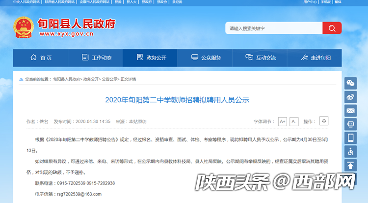 7、公示:2020年4月30日在旬阳县人民政府网发布2020年旬阳第二中学教师招聘拟聘用人员公示,公示期为4月30日至5月13日。