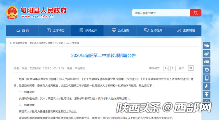 1、发布公告:根据《陕西省事业单位公开招聘工作人员实施办法》《关于加强和改进基层事业单位招聘工作的通知》《关于明确紧缺特殊专业人才范围的通知》精神,经县政府同意,安康市人社局核准,决定为旬阳第二中学招聘一批高层次人才教师和一批紧缺学科教师。