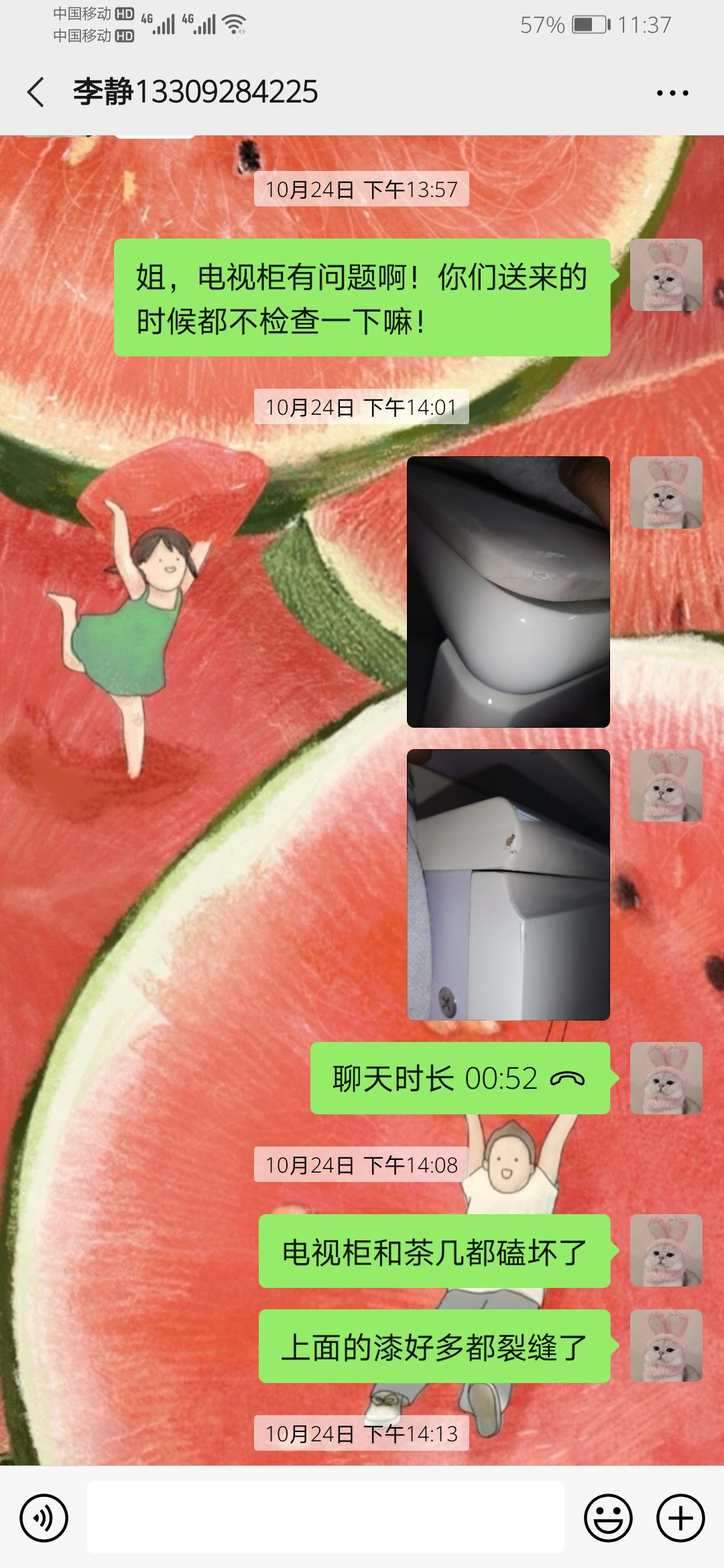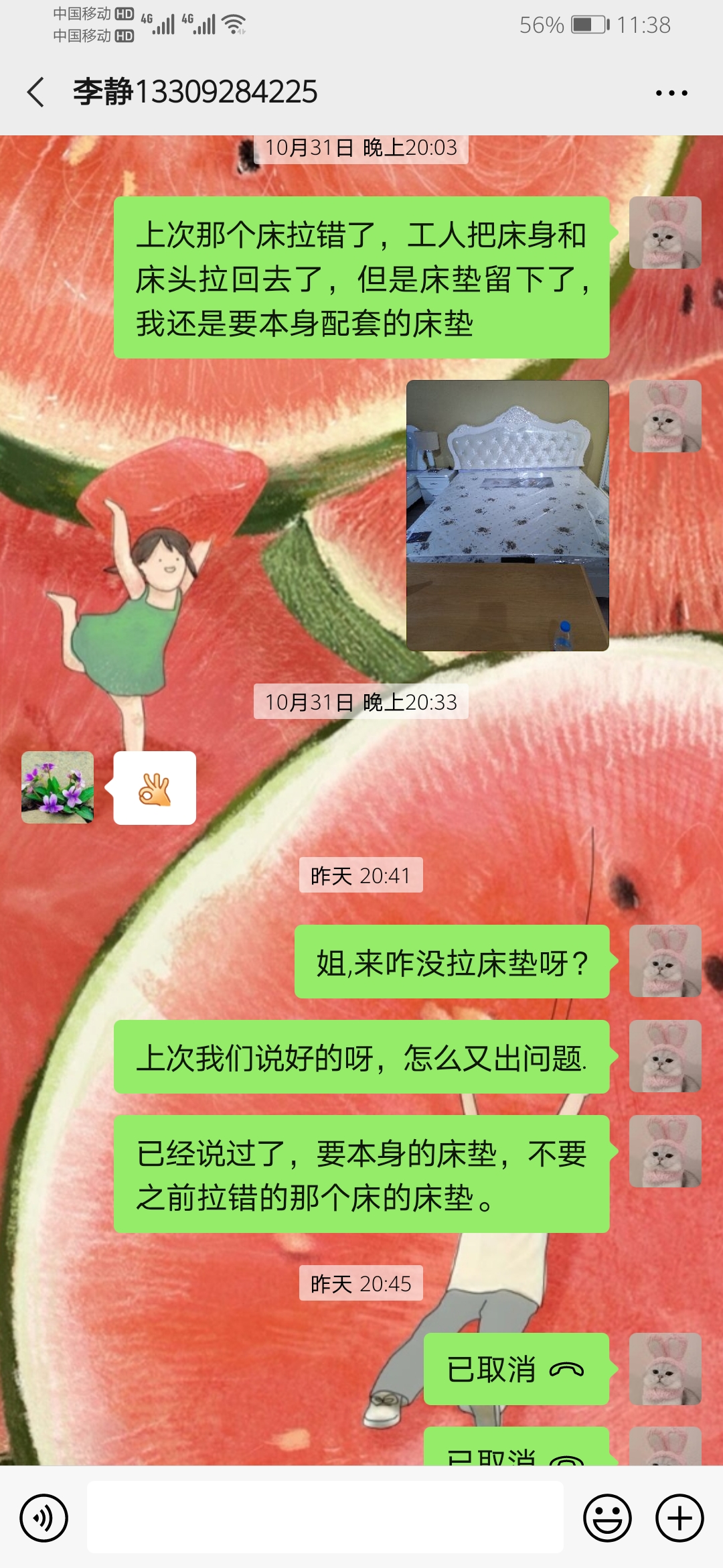 来来去去沟通了很多次,让她按我原本看好的款式给我发货,她只是说她们已经来了几次,从头到尾没有一句抱歉的话,自己拉错了怪在我们头上,说我们太细心。后来多番沟通卖家答应按原本的款式发给我,包括床上本来的床垫也会给我拿我付款时看中的款式,结果昨天晚上来送货时床拉的是样品,床头掉漆,床架上有好多螺丝上的窟窿,也没有按约定好的拉床垫,我再次联系卖家她不接电话,发微信不回,发语音电话也不接,后来就关机了,我老公发短信给她说事情就这么完了?早上她回复信息里面全部都是责怪我们说我们事儿多,她让人去了几次了,去了几次都是因为她们发货不检查也不和买家沟通导致的,还说我们要赠品(赠品是付款前卖家答应给的并且买家具都会送,我并不知道这有什么错)等等一系列不讲道理的话,我发微信给她说她做人没有诚信,她不说解决问题就开始骂人,态度极度过分,说一些婊子骚货等等一系列不堪入耳的词语,并且将我拉黑还不停发来消息对我进行人身攻击 。