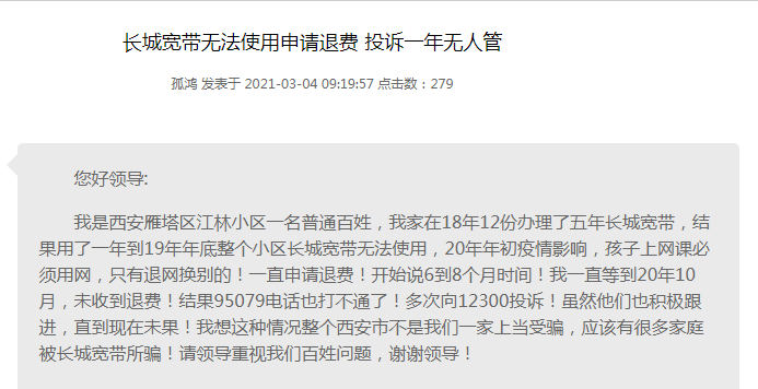 我家是太华北路谭家小区,长城宽带从三月份断网至今,将近一个月了,打电话片区负责人说明天就好,明天就好,家里有小孩上学,需要网络,电视也看不成了,手机的流量也高达150元左右,小区贴出告知说长城宽带和物业没有洽谈好,进不了小区,而我打长城宽带的电话,那边的领导说,今天就好,明天就好,总是一拖再拖,我感觉到有点上当受骗的样子,元月份刚交了三年多的长城网络费用,希望有关部门监督,好好查一查,给我们公民合法的权益。