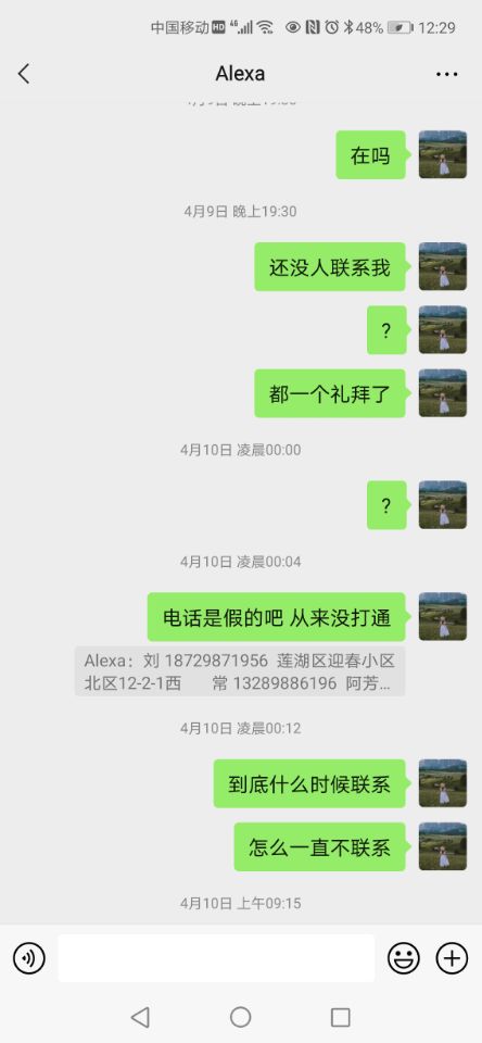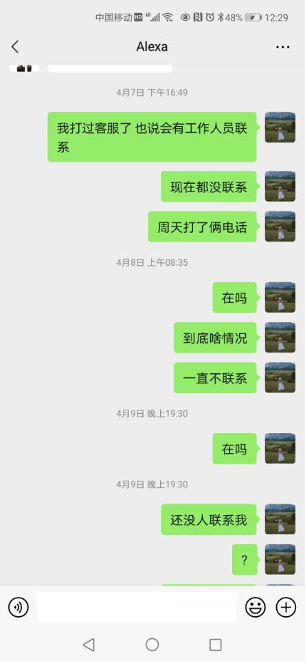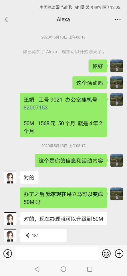 我出于善意,一直等待网络恢复,期间询问联系我办理网络的王娟(工号:9021,微信号:WJxiaoheiyang ,昵称:Alexa)得到的回复都是在施工,让等等。