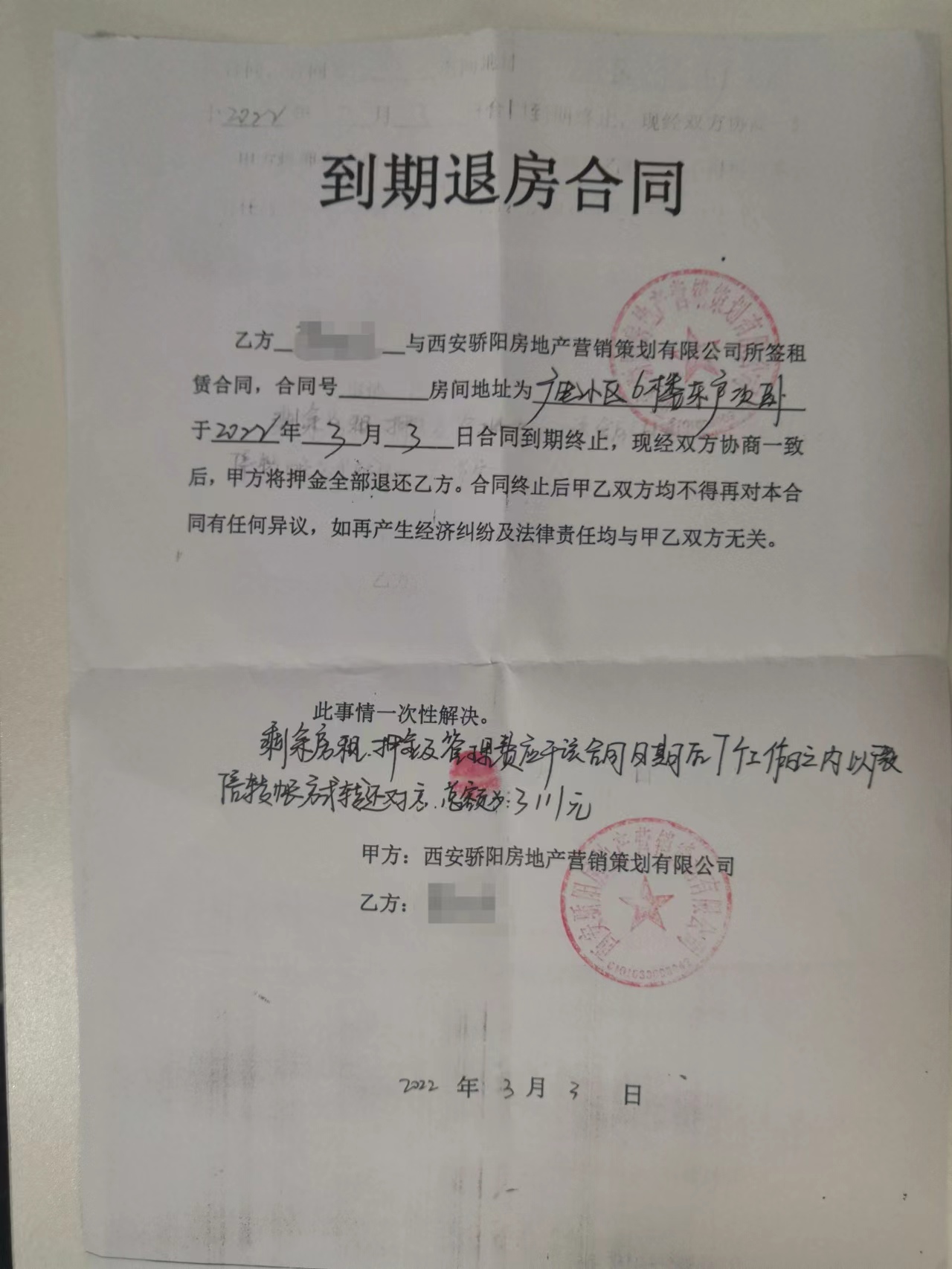 我与西安骄阳房地产营销策划有限公司签订的房屋租赁合同,租住碑林区长胜街中段广电小区的次卧一间。合同至2022年9月11日到期,押一付三。今年2月27日通知说不和房东续签,要让我们换房,我不打算租住他们公司的房子,就办理了退租手续,签订了到期退款的协议。