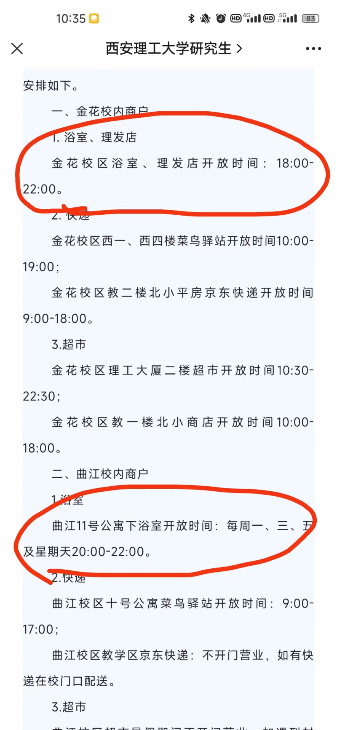 首先,是最基本的洗浴要求。西安理工大学曲江校区为学生提供的,是每周一、三、五、七这四天20点至22点的洗浴时间。周二、四、六则不提供洗浴。这让人难以理解。伏天酷暑的温度,每日通勤于宿舍和教研室的路上,难免会有汗液。我们只是想每日冲洗一下身上的汗液,保持清爽不至于不能洗澡的日子里带着臭味生活。我想,这个需求应该不难满足。可是,当我拨通学校的管理中心时,得到的回复却是“没有办法”,当问及为什么金花校区能够做到而曲江校区却做不到时,却被以“情况不同”搪塞,而没有确切能说服人的理由。至于浴室管理人员,则是直接挂掉电话。属实让人难以接受。