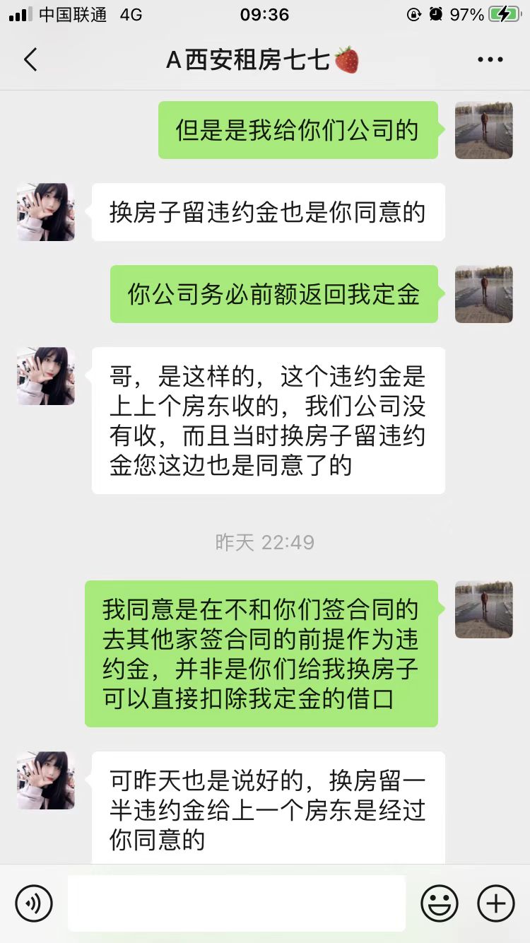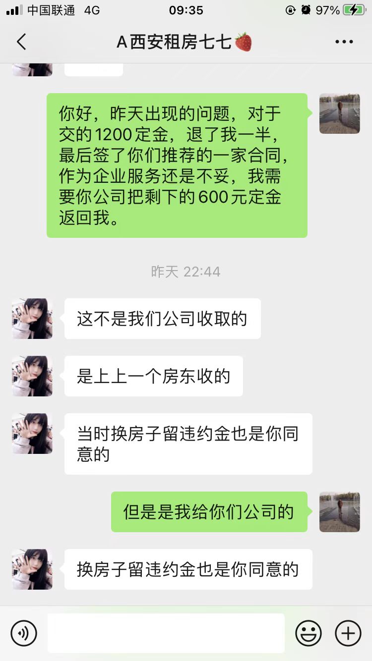 西安舒心窝置业有限公司,2022年9月16日租房找了中介,答应说交了定金(1200元一个月房租),可以在履行签合同之前换其他房子直到满意为止,并未提及换房退不退定金取决于房东,而且签合同之日签定金的房子中介未说明把发现的房子有破损、空洞、坏灯、电线暴露松动的问题的修复到位。
