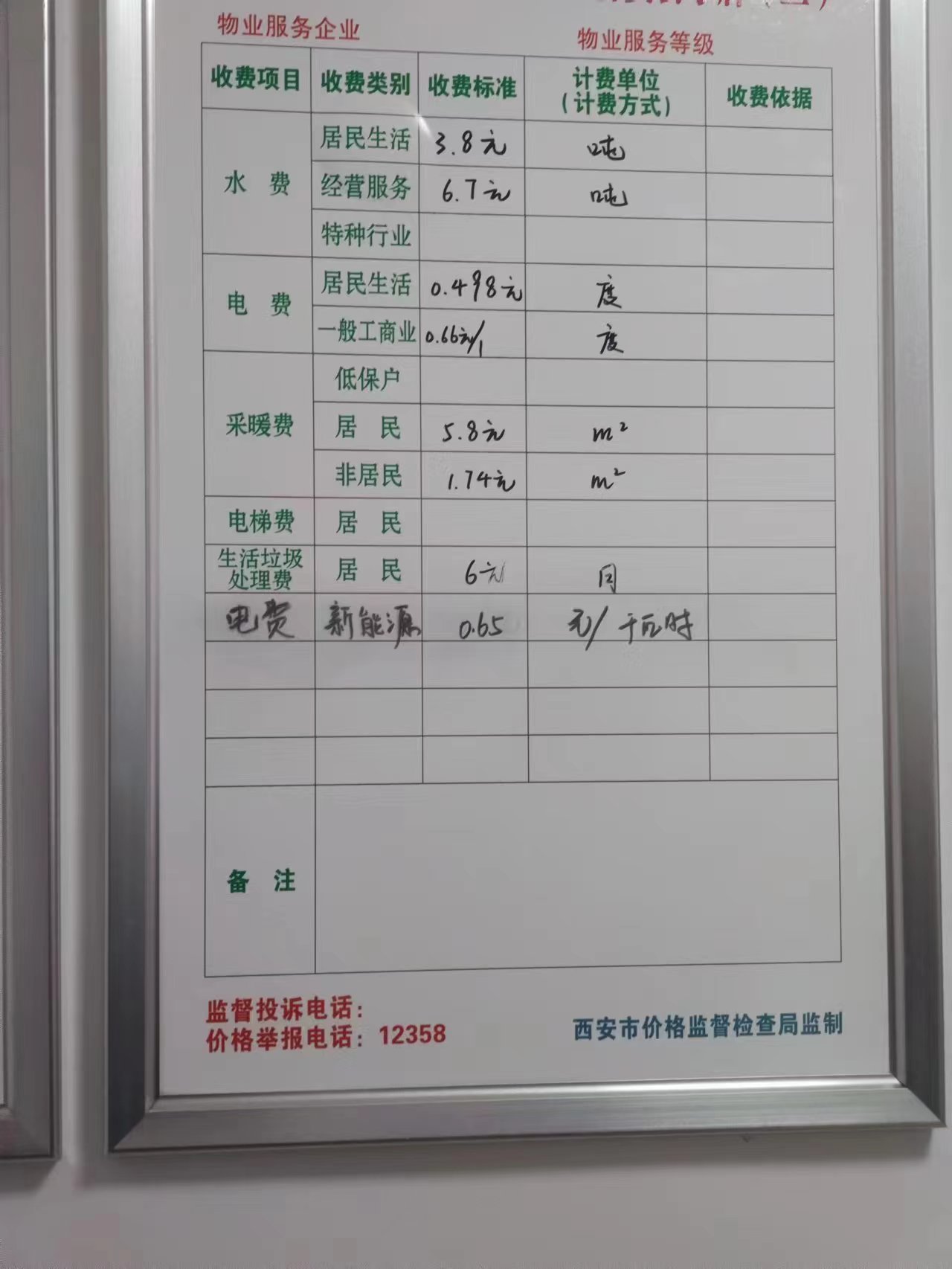 2023年4月19日,韩森寨市场监管所执法人员对位于新城区幸福南路5号的西安华清物业管理有限责任公司进行了检查,现场在该单位收费处公示栏信栏中标注有:新能源车收费标准为0.65元/度,现场随机抽取“收费票据”,与公示情况一致。