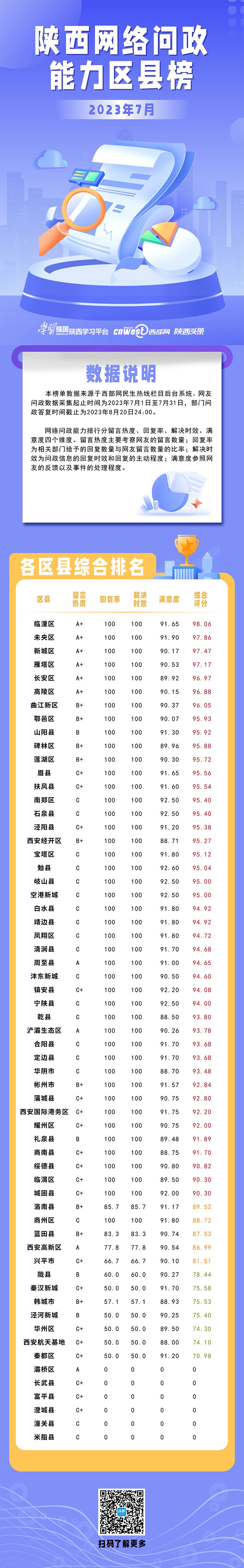 根据综合评分,西安临潼区、西安未央区、西安新城区、西安雁塔区、西安长安区、西安高陵区、西安曲江新区、西安鄠邑区、商洛山阳县、西安碑林区十个区县(开发区)得分最高,位列7月网络问政能力区县榜前十名。
