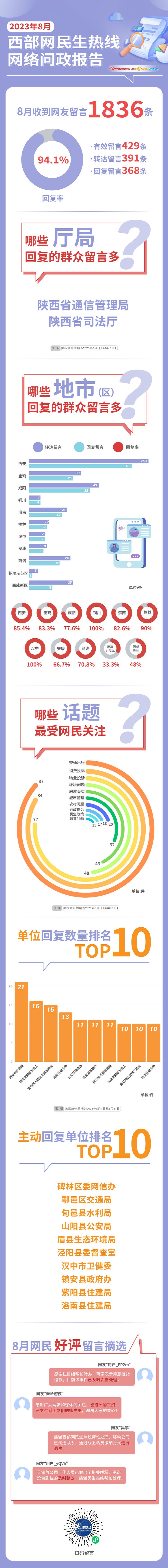2023年8月,西部网民生热线收到网友留言1836条,其中符合受理条件的网友留言429条。栏目组向陕西省、市、县(区)各有关部门单位转办391条网友留言,其中368条留言已办结回复,整体回复率为94.1%。