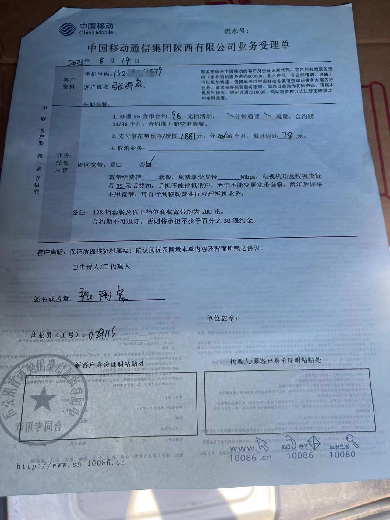 2023年8月,有人佩戴移动人员工作证,自称中国移动公司西安市凤城路店的工作人员,以回馈老客户的名义主动联系我上门办理营销活动。要求承诺不转网不换号就可以送礼品,之后在我不知情情况下其私自操作我的支付宝花呗预缴话费共计1881元(收费单位为中国移动凤城路店),后被我发现辩称会分24个月为我返还话费,并赠送一个小家电(我选择了空气炸锅)。该工作人员出示了中国移动公司的工作证,并与我签订了移动制式纸质合同(有留存)后将空气炸锅赠与我。然而,办理业务后对方只为我缴纳了3个月的话费(不连贯,中间几次催促,共计交过3次话费)就以各种理由推脱缴纳。后该工作人员号称已经离职,为我提供了另一个工作人员手机号,却无法接通。