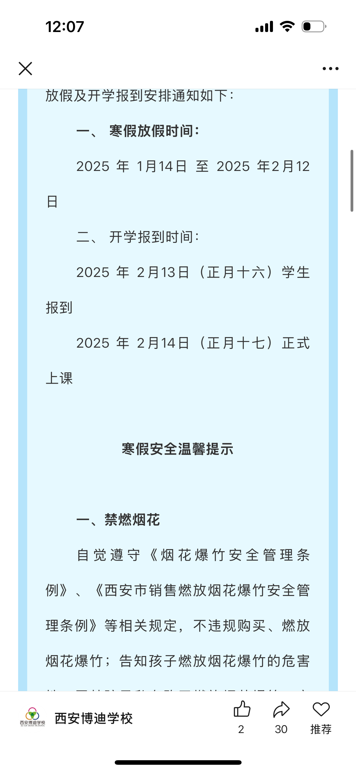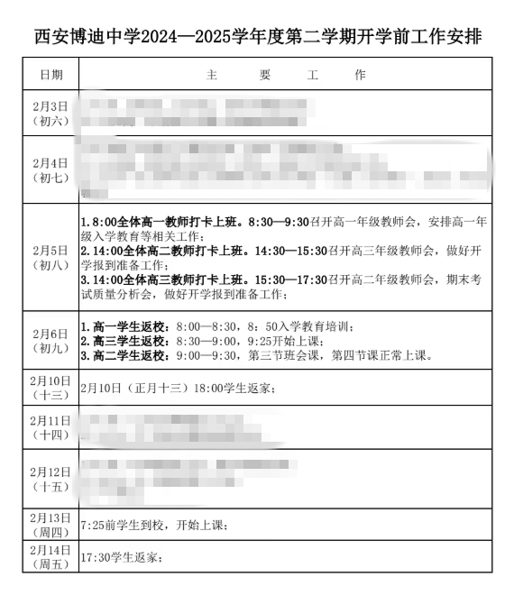 学校发通知说2月14号开学,私下告知学生2月6号开学,寒假过年期间为什么要补课,按正常时间开学很难吗?让学生无法接受!希望西安教育局不要坐视不管,给予一个答复。