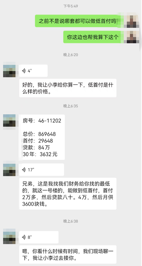 我们是四川人,2月16日通过去到泾河新城滨江翡翠城售楼部,置业顾问一堆人围着我推销,我想回去和家人商量一下,他们就说先交钱把这个房子定下来,首付这么低有什么好犹豫的,最低价卖给我们,46号楼1单元1202号原价125万元,折后86万元。