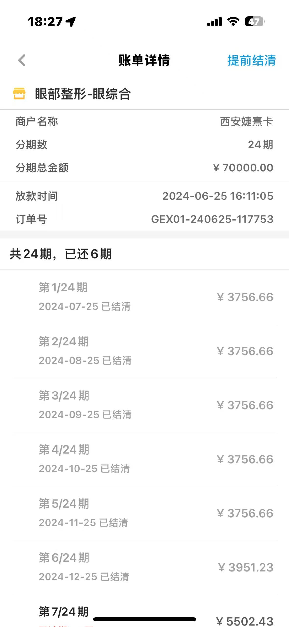 后面我发现一点效果都没有,去医院找他们就是说需要叠加维护,然后带我去的那个人知道我的经济情况还不上贷款,给我退了2万块钱,说的是带我去医院给的提成,她不想挣我的钱就把给她的退给我了,但是婕熹卡医疗美容一直不给处理退款的问题。一共是7万元分了24期,每个月需还3756.66,总共是90159,光利息就要2万多,利率应该是25%左右,目前我已经还了6期,实在是无力偿还,已经逾期2期了,分期公司打电话发信息对我威胁。