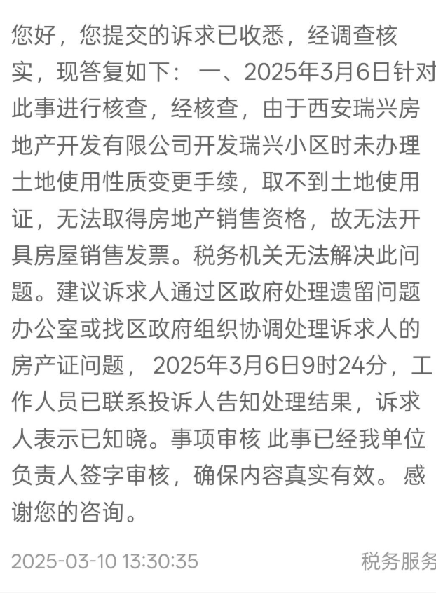 经核查,西安市瑞兴房地产开发有限公司(纳税人识别号:91610115710141334P)开发建设的瑞兴家园2号楼、6号楼土地属性为工业用地,待其完善土地属性更改手续后,税务局可提供发票开具业务。
