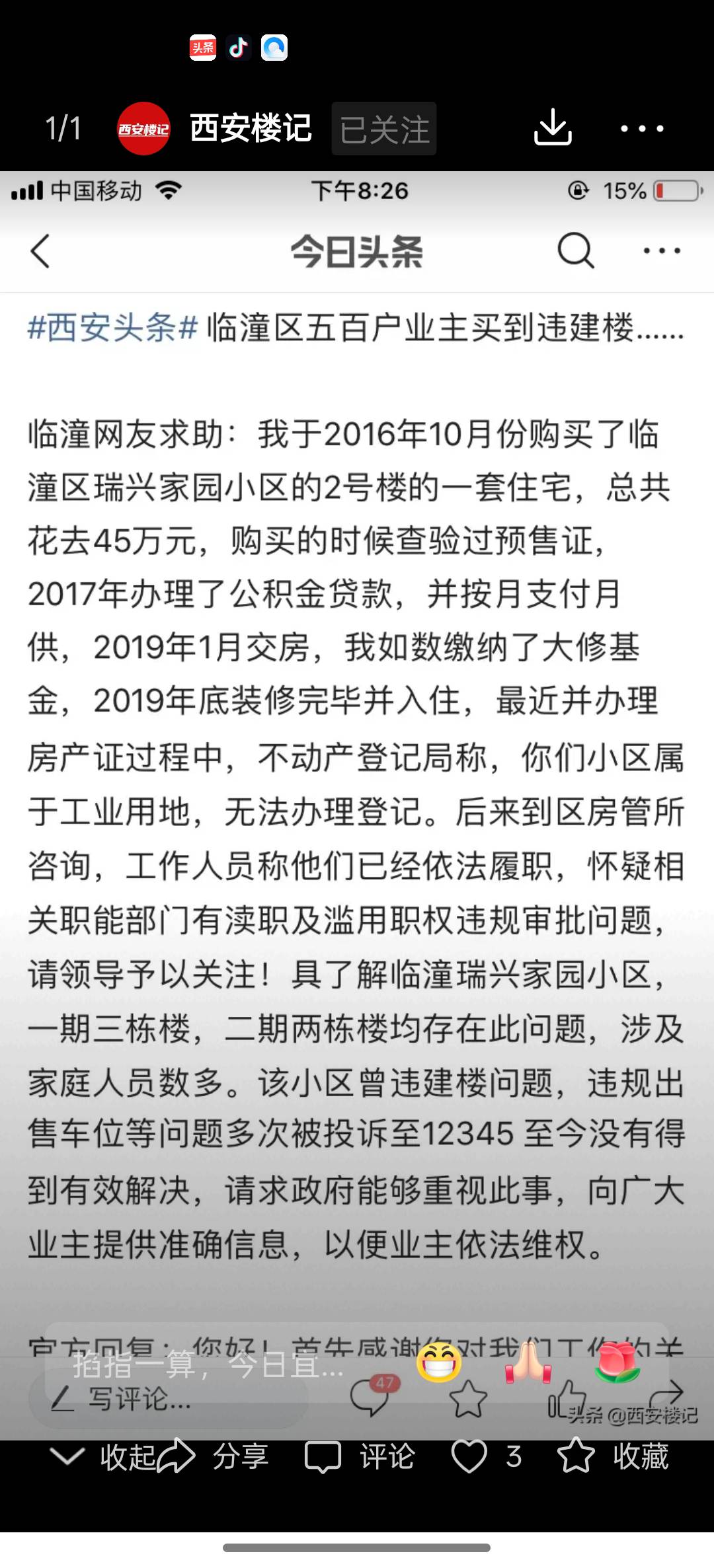 西安市临潼区人民政府办公室回复:近日,网友反映,“临潼区瑞兴小区2-6号楼不办房产证 不开具购房发票”,我区已收悉,按照要求,我区责成相关单位进行调查处理,现将有关情况回复如下:
