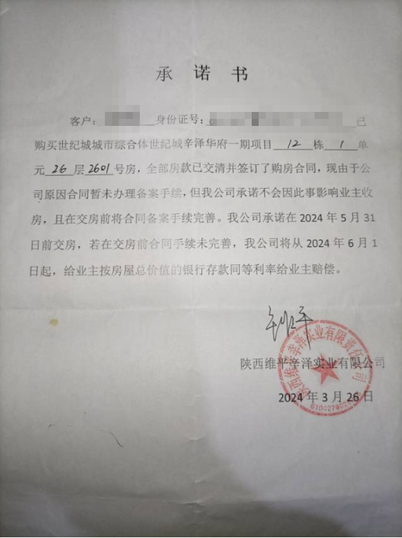 您好,我2020年9月10日在彬州市购买西部集团和陕西维平公司合作开发的辛泽华府房子12号楼26层2601。2020年9月10日交款22.964万元,2020年12月16日交款34万元,合计交款56.964万元,房款已全部交清。2021年4月份签订了购房合同并送到西部集团盖章,至今为止向西部集团不给购房合同并收不了房。请帮助我要回购房合同,谢谢。