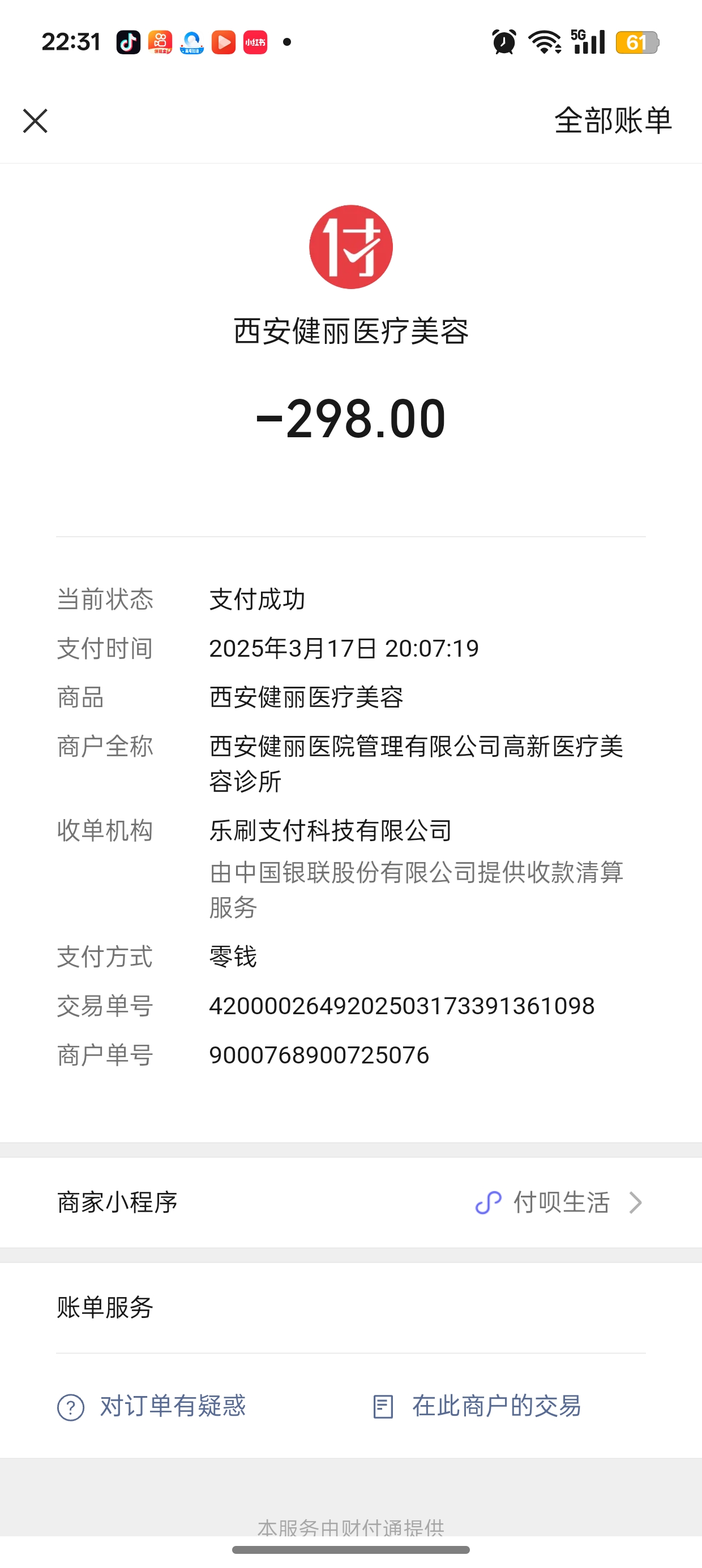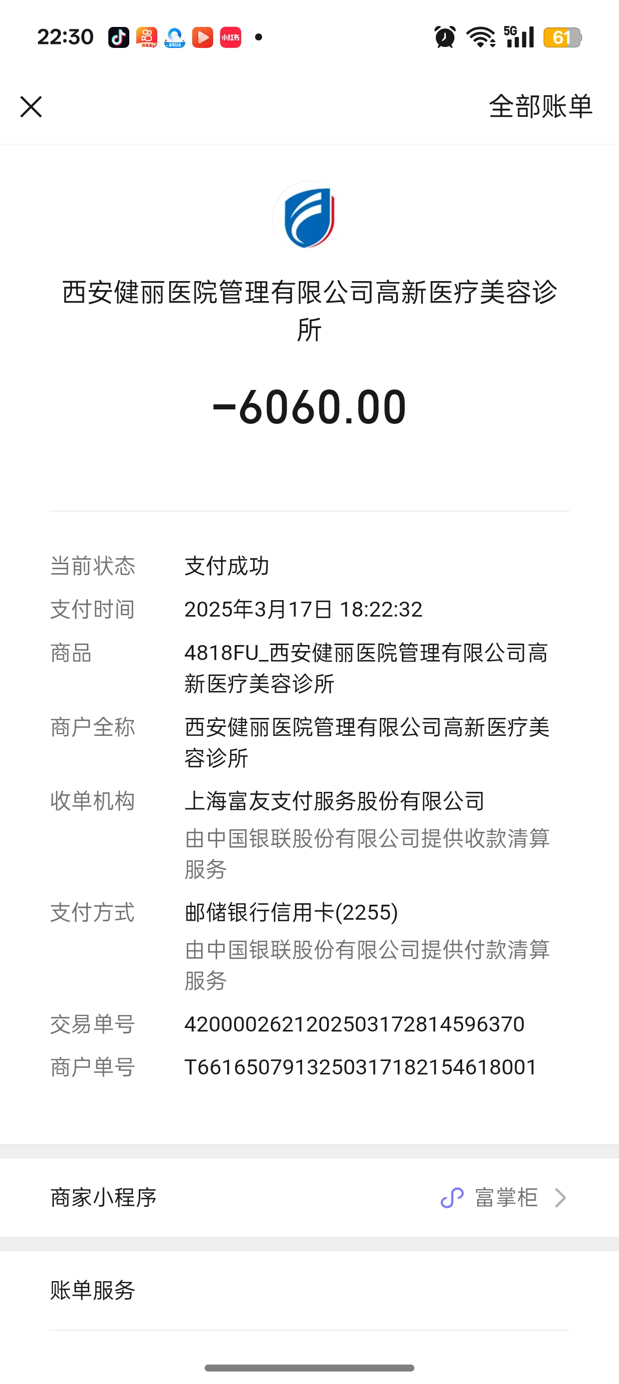 我在抖音看到西安健丽医美宣传去眼袋,3月17日做了去眼袋、泪沟填充和川字纹填充,共付款6358元。术后不久出现右眼凹陷严重、面部不平整、眼周出现很多皱纹、川字纹鼓包、一直头疼不见好装、眼睛干涩、遇风刺痛等情况,去医院复查了一次,工作人员态度不好,各种言语搪塞。术前承诺的合同协议术后什么也没有,收款收据都没有,但我有付款记录,我要求全额退款。