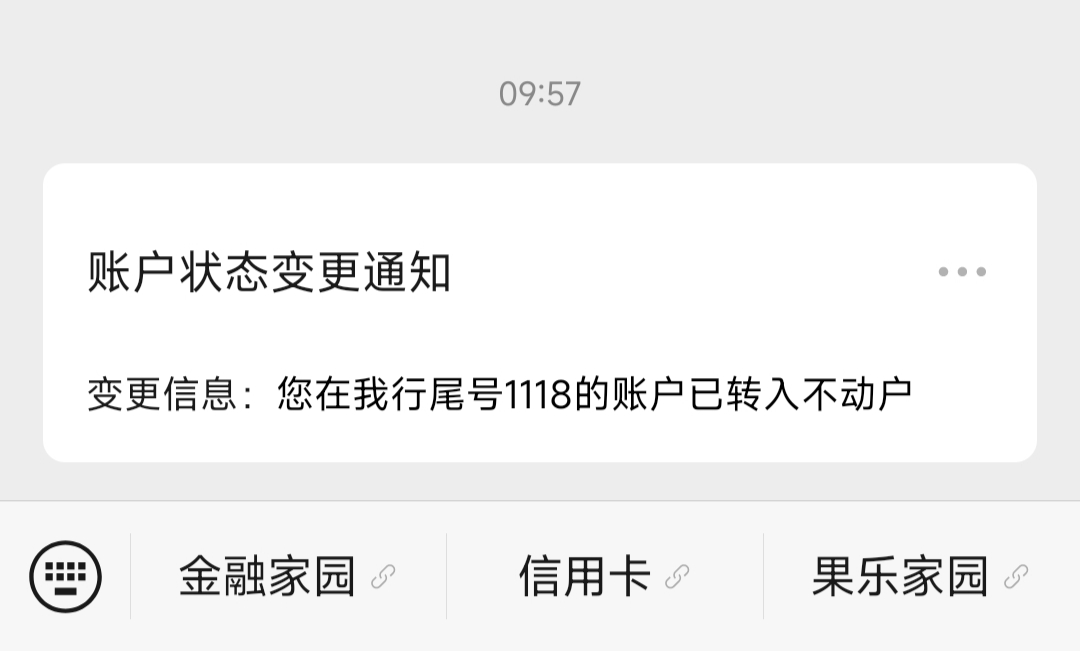 今天长安银行微信公众号突然发送一条账户状态变更的提醒,我立即拨打了长安银行0916-2687716网点电话,客服表示一年内不动账就会被列为长期不动户,需要我本人持身份证及银行卡到网点进行处理。