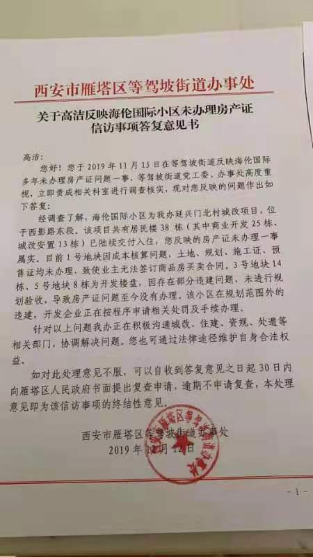 本人2014年全款购入西安市雁塔区海伦国际西区房产一套,十多年过去了房产证任然未办理,政府单位多次给出承诺都未落实。