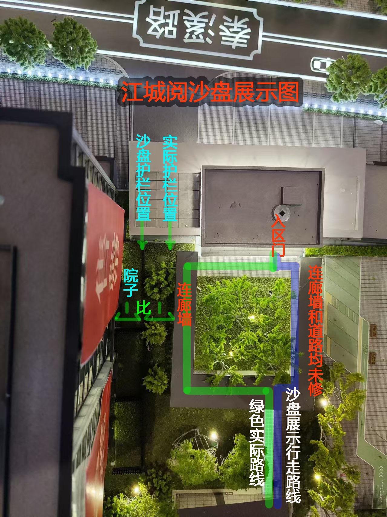 1、建成的入户庭院与当初给我看的设计图和沙盘不符,少修了一条直路和一面风雨连廊墙。导致所有人进小区后都必须绕路经过我房子院前。