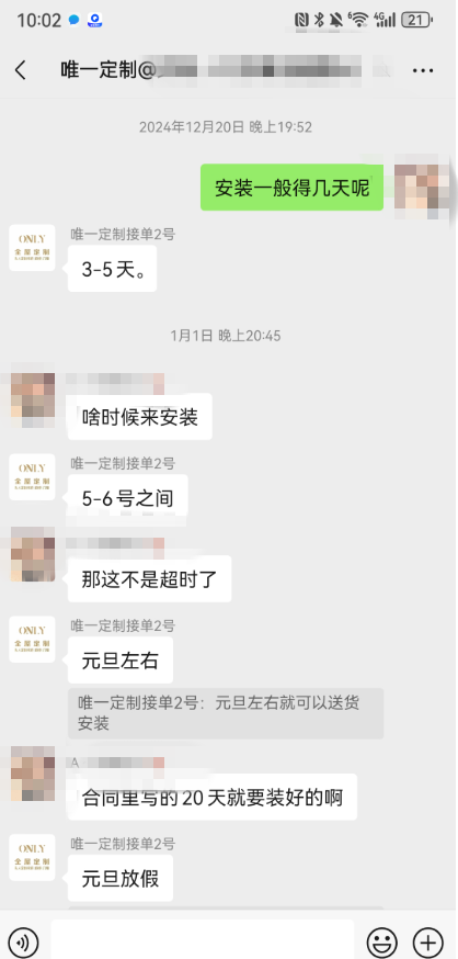 本人是渭南市的一名消费者,2024年12月在渭南ONLY唯一全屋定制订购了柜子安装服务。