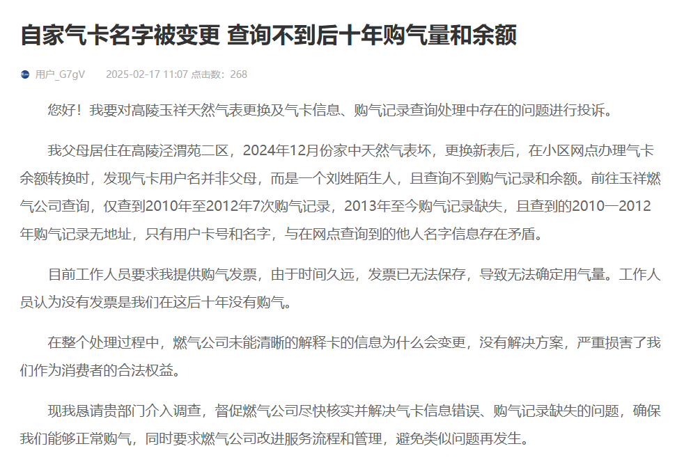 2024年11月,泾渭苑二区父母家中气表坏换表,在小区购气网点置换燃气余量,工作人员查询不到历次购买记录,用户名变更为姓刘的陌生人。工作人员留下卡继续查,在后来的通话中告知气卡信息串了,无法查找,让父母去玉祥燃气公司解决。在玉祥燃气公司输入卡号查询到2010一2012年7次购气记录,之后十多年没有记录。玉祥燃气公司领导要求提供十多年的购气发票,无法提供就认为没买气。因为父母购气使用现金,时间久远未保存发票。玉祥燃气公司不向购气工作人员了解情况,对于自身工作失误、购气系统信息出错、无故变更用户名影响查询、用户购气记录不完整等情况不负任何责任,只是一味要求用户提供购气证据实在不妥,在沟通中拒不承认网点信息出错,有失企业服务的宗旨。