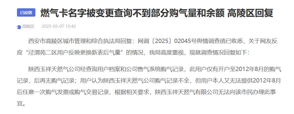 2025年2月17日在贵网发帖,3月7日高陵区城市管理和综合执法局回复不恰当,4月15日本人前往该单位向经办人播放了与购气网点工作人员的通话录音,经办人对回复不严谨向我表示了歉意,并告知此事不归他们管。在此,我再次发帖,请求相关部门调查清楚,给出一个合理的说法和解决方案。