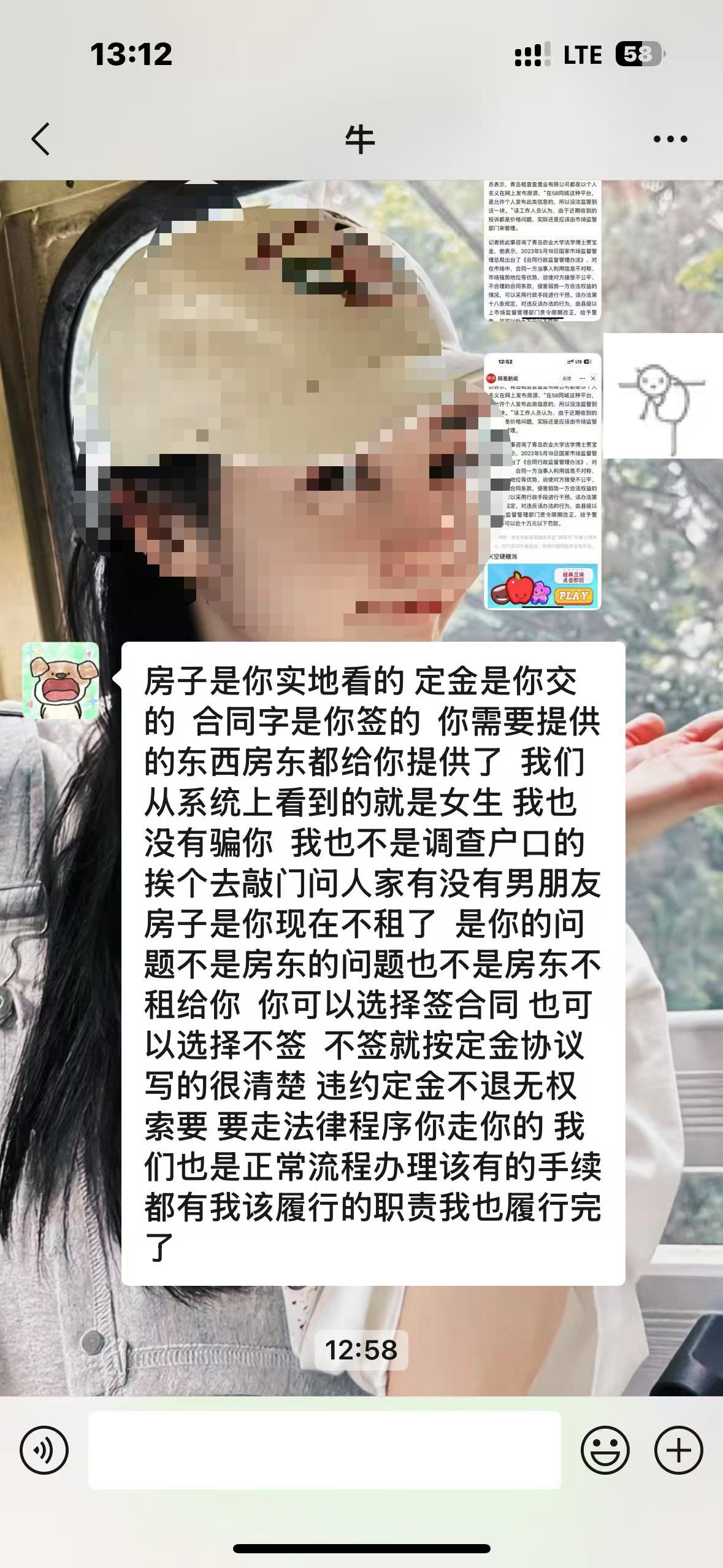 2025年4月,我通过微信小程序在安居客上寻找租房信息,联系到西安客来安住房租赁有限公司员工,看过长安区一小区房屋后,中介承诺该房屋是女生合租,于是我签订了定金合同,支付了定金和中介费。后来签订租赁合同时,我发现房东和签订定金合同的不是同一人,而且经询问物业得知,这个房子有男生租住,但中介并没有告知我,而且他也没有告知我签合同的不是房东本人。中介声称他们已经审查过了,该房没有问题,意在促成合同达成。