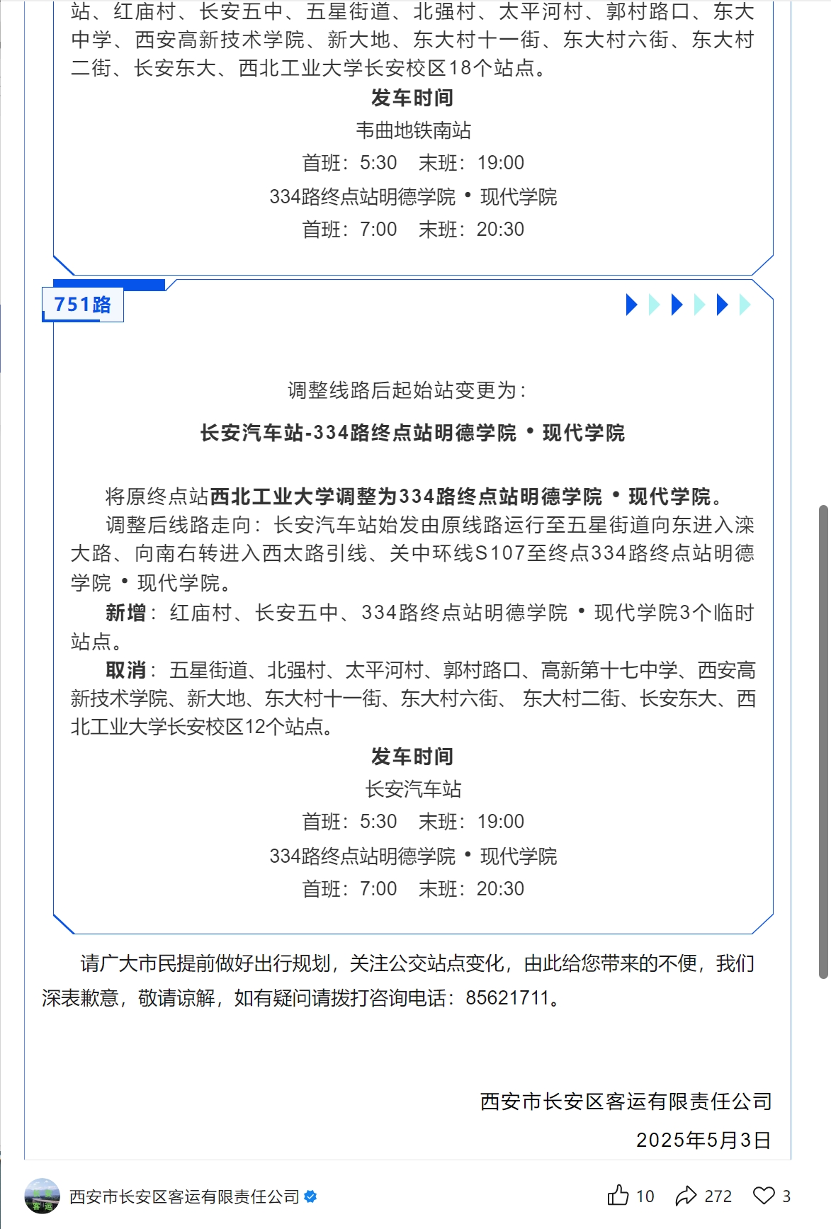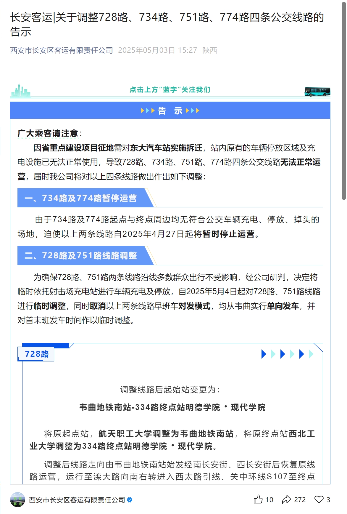 本人系728路/751路(东大方向)常驻乘客,长安区客运有限公司 2025年5月4日线路调整方案中全时段切断18个核心站点服务且无应急措施提出严正质疑: