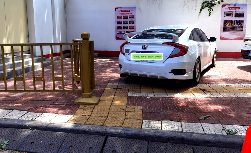 西安市雁塔区昌明东路省石油化工学校南门东侧,道路右侧从这里开始变窄,但该校门面房入驻的各汽修店及其他车主经常违法占道停放、经营。甚至有某门店负责人指使店员非法私拆市政护栏、私自改设路沿加搭斜坡垫停车、压坏市政道砖,将人行道当做专用停车场,并派店员看守供其顾客及店员停车(附近有监控记录,周边居民及本人亦有手机拍照录像为证),侵犯行人合法路权和市政公共财产,威胁该街区居民、行人、大中小学学生的出行安全,破坏该“红色双拥街区”的市容市貌。