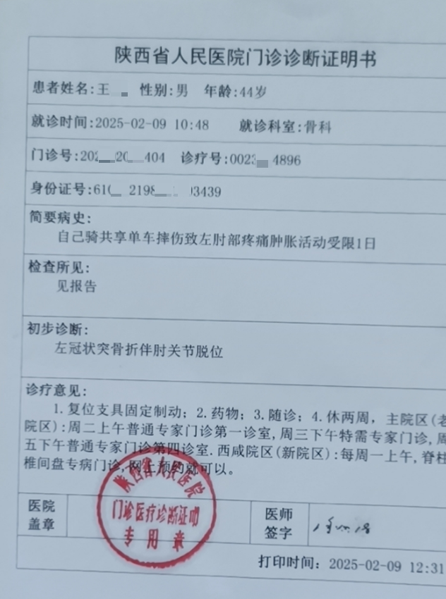 王先生反映,2月8日他骑共享单车时,骑行了不到500米车辆链条突然掉落,自己措手不及直接从车上摔下来了。随后,王先生立即联系客服,客服让王先生先去医院做检查,看完病可以报销。于是王先生前往医院检查,结果显示“左肘骨折”。