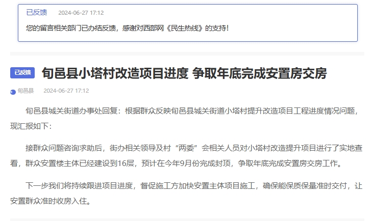 旬邑县城关街道办事处回复:根据群众反映旬邑县城关街道小塔村提升改造项目工程进度情况问题,现汇报如下: