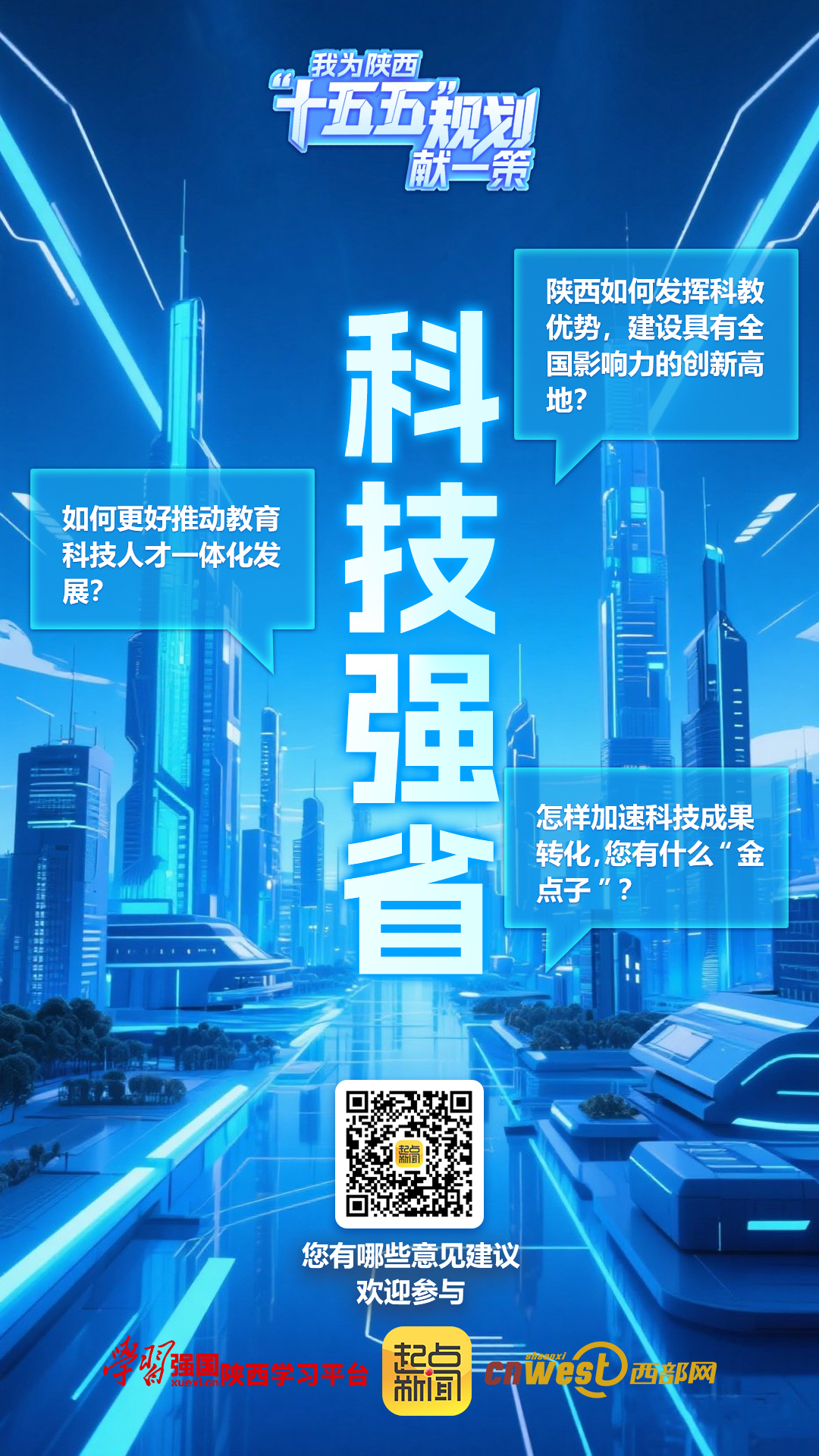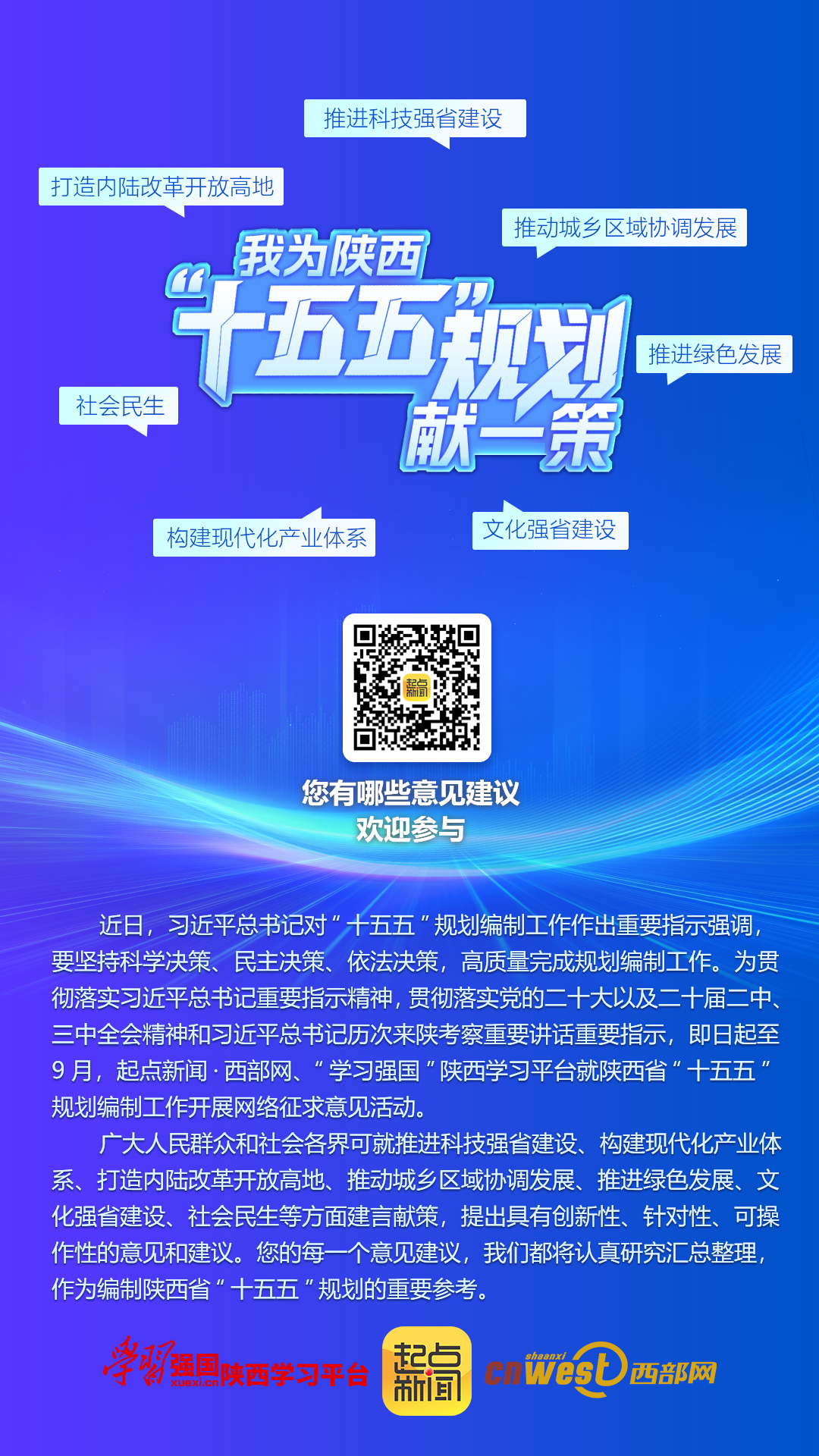 据悉,这次网络征求意见活动分别在起点新闻客户端、“学习强国”陕西学习平台、西部网开设建言专栏,广大网友可进入相关页面(点击进入活动征集页面),就推进科技强省建设、构建现代化产业体系、打造内陆改革开放高地、推动城乡区域协调发展、推进绿色发展、文化强省建设、社会民生等方面,提出意见和建议。