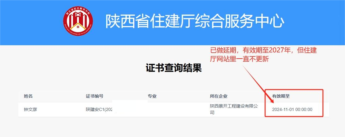 2、安全员C证2024年9月已做延期,但是住建厅网站里证书有效期时间一直未做更新。