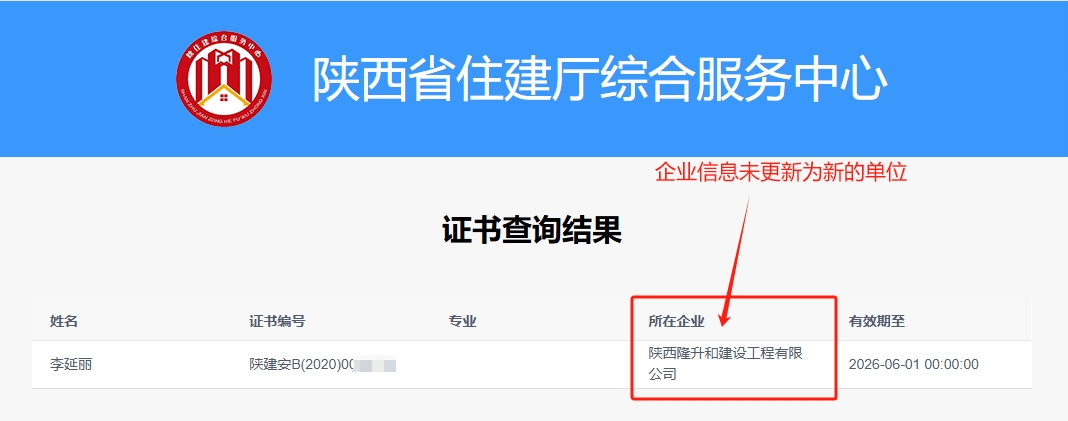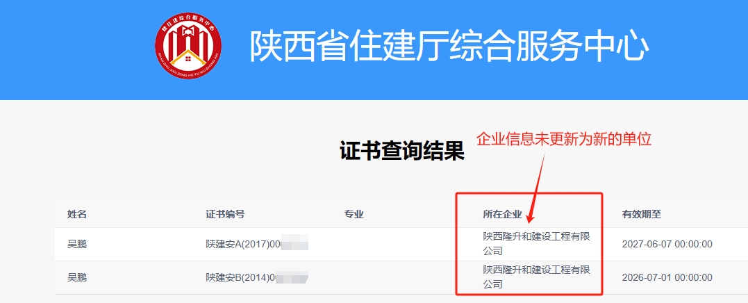 1、安全员B证变更到新单位,陕西政务网显示已经办结,但住建厅网站里电子证书的信息还显示的原来单位,一月了一直不更新,无法使用。