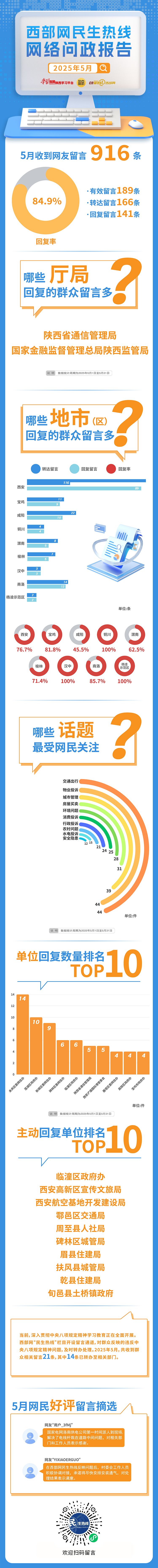 2025年5月,西部网民生热线收到网友留言916条,其中符合受理条件的网友留言189条。栏目组向陕西省、市、县(区)各有关部门单位转办166条网友留言,其中141条留言已办结回复,整体回复率为84.9%。