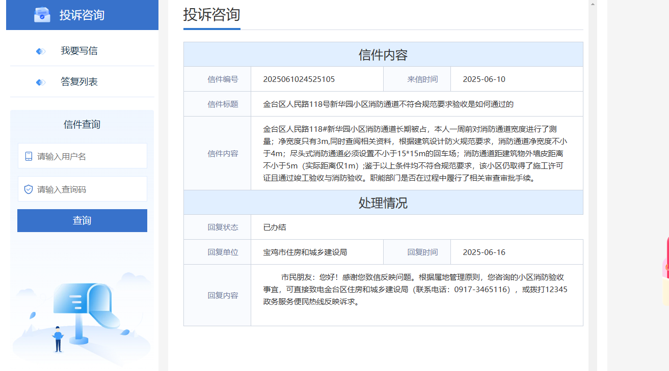 宝鸡市金台区人民路118#新华园小区消防通道长期被占,多次反应无果。本人测量消防通道净宽度只有3m,不符合《建筑设计防火规范》GB 50016-2006第6.0.9条:消防车道的净宽度和净空高度均不应小于4.0m的规范要求。项目是如何通过竣工验收?竣工验收时是否进行了消防验收、消防通道尺寸不符合规范是如何通过验收的?本人通过宝鸡市住建局官网反应问题,被告知所反映问题归属于金台区住建局管辖,通过12345反应到金台区住建局,金台区住建局告知所反映问题不属于他们管辖,应向金台区消防救援大队反应。消防通道不合格规范竣工验收已通过到底归属于哪个部门管辖、应该由哪个部门启动问责程序?希望职能部门能够引起重视,不要让反应的问题推诿而石沉大海。