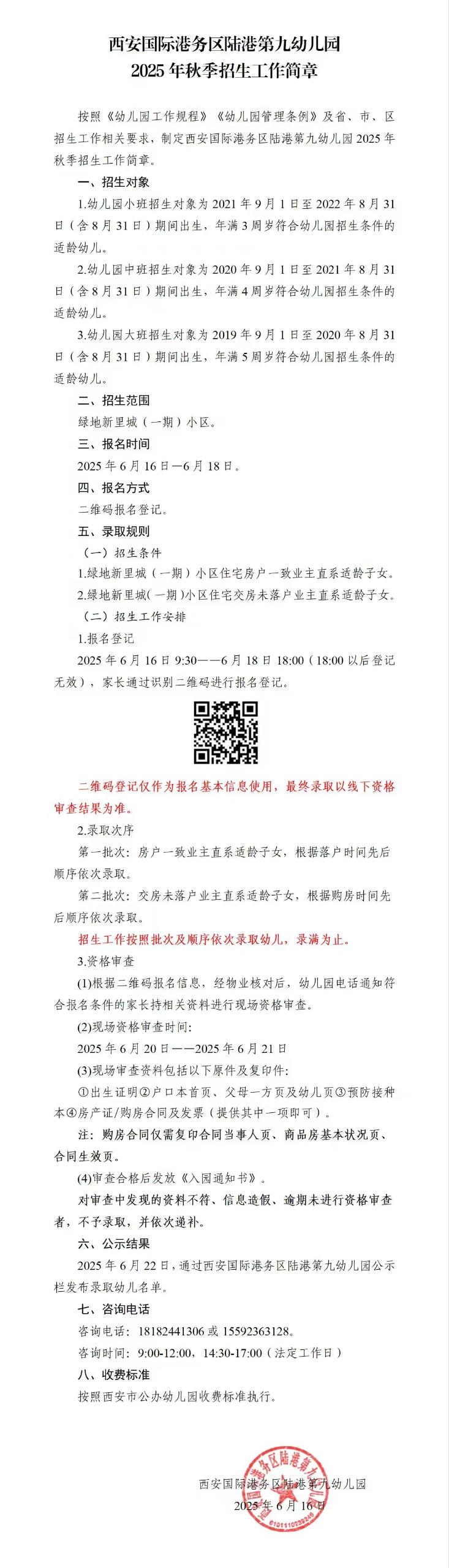 我是西安国际港务区绿地国港新里城二期的业主,小区内的幼儿园停工,至今未能正常招生入学,对面的陆港第九幼儿园最开始规划在绿地新里程二期,但落地到了绿地国港新里城一期。现在陆港第九幼儿园已经开始对一期业主办理入园登记手续了,但二期业主却没有资格进行登记。