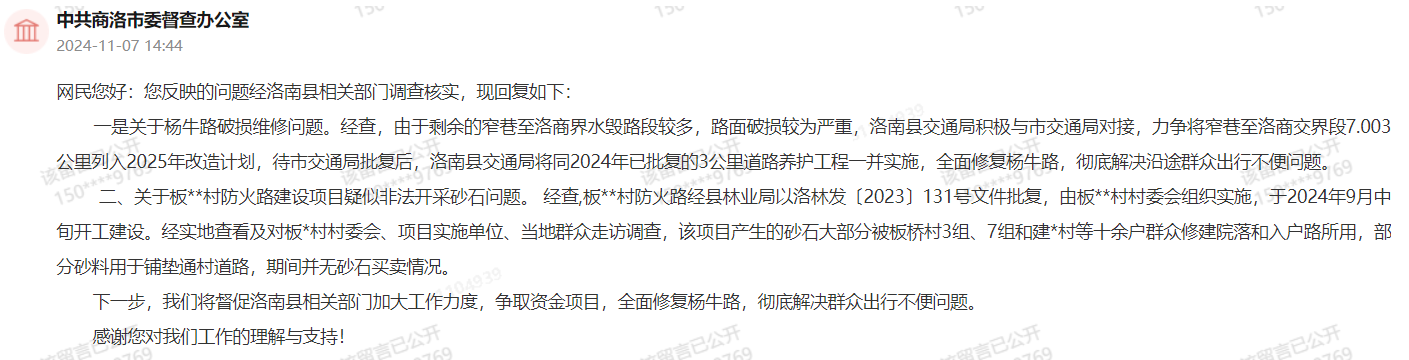 2024年10月26日,我在网上留言,希望政府能够制止大规模运输砂石车辆损坏道路,将洛南县景村镇途经景兴村、建兴村、板桥村的通村道路进行修复。洛南县交通局及商洛市委督查办公室公开进行了回复,回复内容如下: