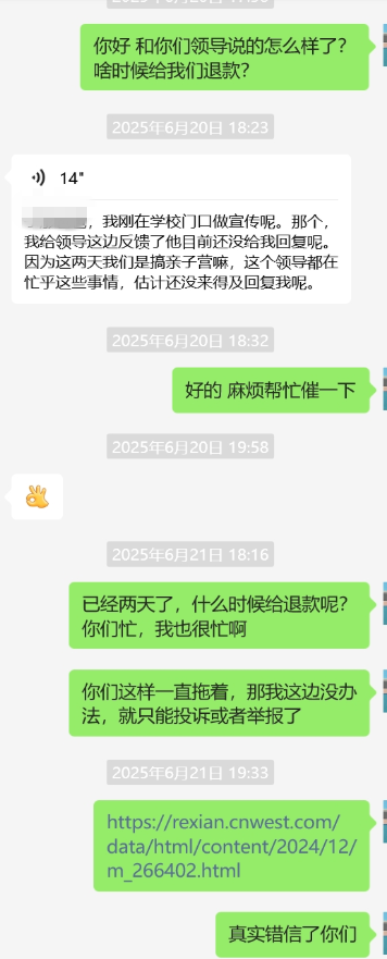 随后我们在6月20日提出退款,对方拖延不给退费。希望整改这样的教育机构,解决我的退费诉求。