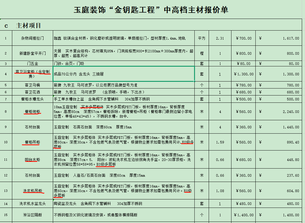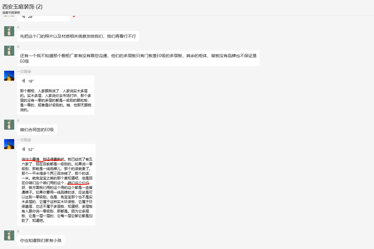 6月11日,该公司找的橱柜加工厂人员在现场测量时说做不了E0实木多层板的柜子,我和装修公司多次沟通。6月12日,该公司以“多花个两三百块钱买一个兔宝宝的板子”为由,要求我加钱才能做橱柜等柜体,在我不同意后对方不再解决问题。