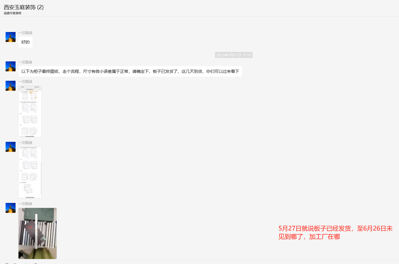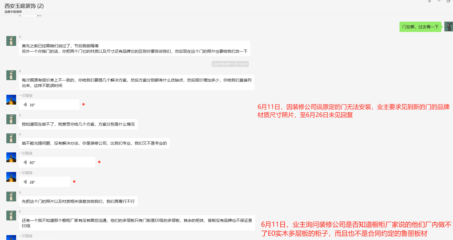 6月11日,装修公司说原确定的门无法安装,我要求提供新门的品牌材质尺寸照片,均未回复。