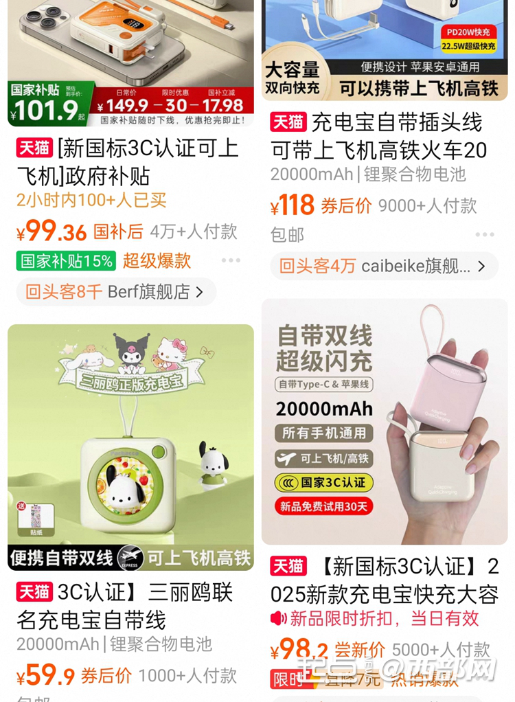 线上市场的响应同样迅速。记者浏览主流电商平台发现,充电宝销售页面已“更新”:“符合3C认证”“民航新规适用”“可携带登机” 等字样被置于页面最醒目位置,部分店铺还专门开设 “合规充电宝专区”。