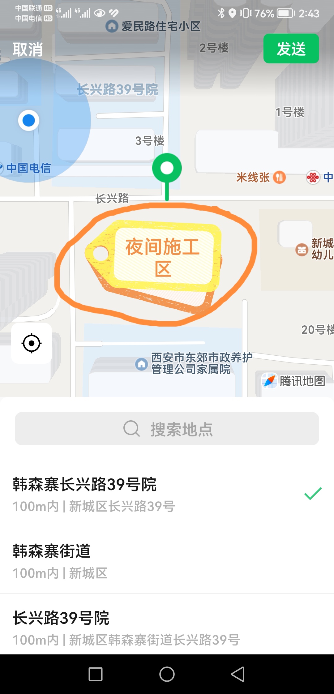 新城区长兴路长兴坊南侧建筑工地,经常性夜间施工,重型机械在施工工地和马路间来回工作,每周不下三次。